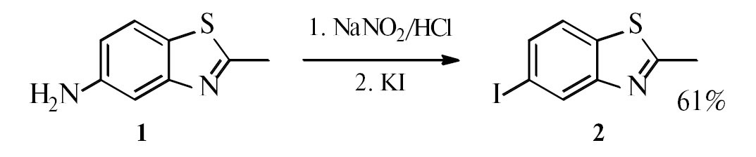 Реакцией диазотирования 5-амино-2-метилбензотиазола (1) и последующего замещения диазогруппы на йод получен 5-йод-2-метилбензотиазол (2) (схема 1) [11].
