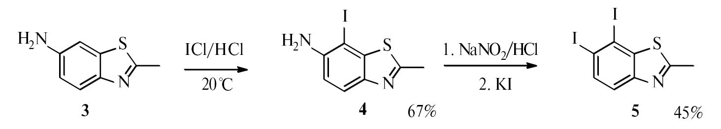При получении дийодзамещенного 2-метилбензотиазола мы основывались на данных литературы [12], описывающих йодирование аминопроизводных бензотиазола монохлоридом йода; при этом атомы йода находились в о-положении к аминогруппе. Попытка йодирования бензотиазола 1 двукратным мольным избытком ICl не привела к желаемому результату: в реакционной смеси обнаружено только исходное соединение 1 и смолообразные побочные продукты. Изомерный 6-амино-2-метилбензотиазол (3) в этих условиях образует 6-амино-7-йод-2-метилбензотиазол (4), который далее превращали в 6,7-дийод-2-метилбензотиазол (5) реакцией диазотирования (схема 2).