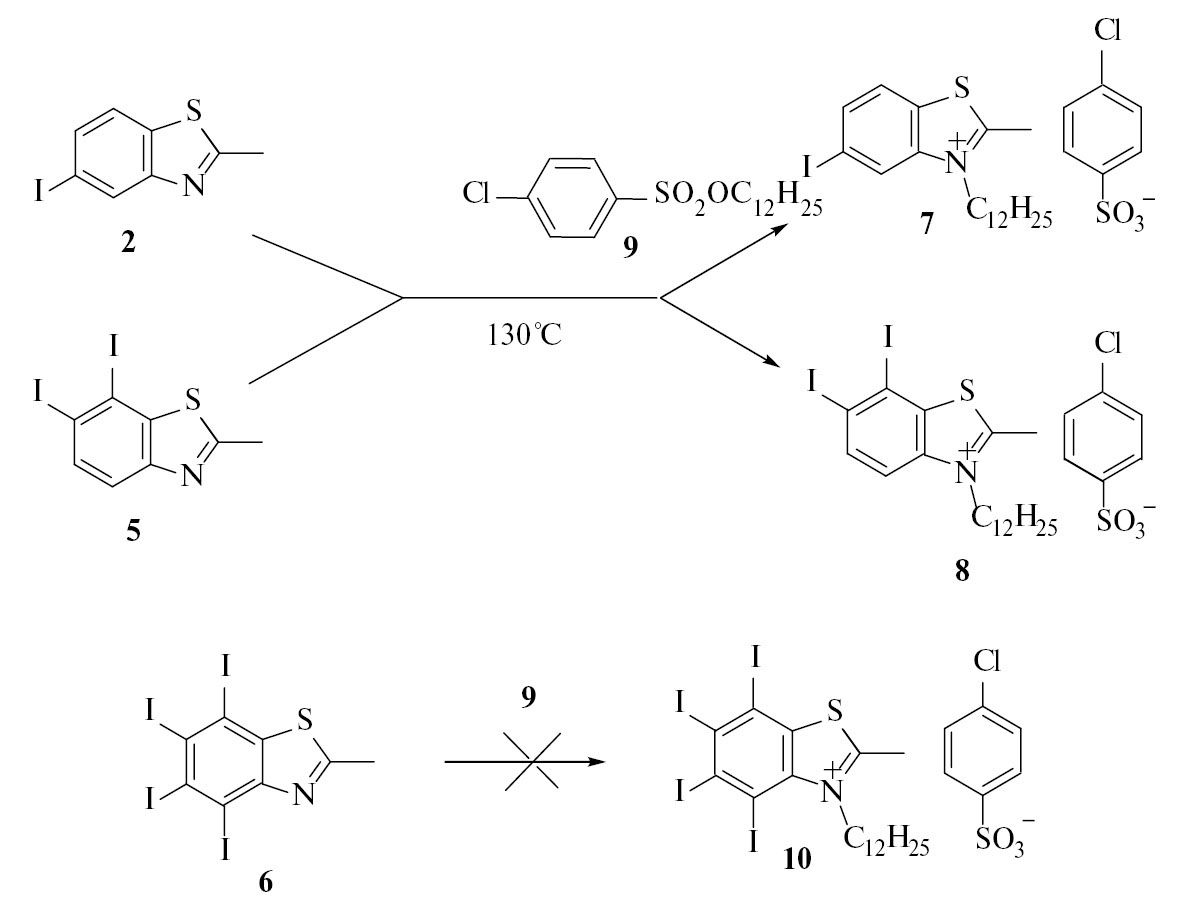Получение солей 3-алкил-2-метилбензотиазолия, содержащих алкильные остатки длиной от С10 до С18, описано нами ранее [14]. Алкилирование проводили при нагревании производных бензотиазола с эфирами п-хлорбензолсульфокислоты без растворителя, получили соответствующие п-хлорбензолсульфонаты. Нами были выбраны производные додецилового спирта — коммерчески доступного реагента, повышающего растворимость красителей; органический анион также улучшает растворимость. Моно- и дийодзамещенные бензотиазолы 2 и 5 превращали в соответствующие соли 7 и 8 по методу [14] нагреванием c додециловым эфиром п-хлорбензолульфокислоты (9) в расплаве при 130°С (схема 3). Соль 2-метил-4,5,6,7-тетрайодбензотиазолия 10 не удалось получить из соединения 6 ни в вышеописанных условиях, ни в ДМСО при 170°С, так как исходный бензотиазол 6 разлагался с выделением йода.
