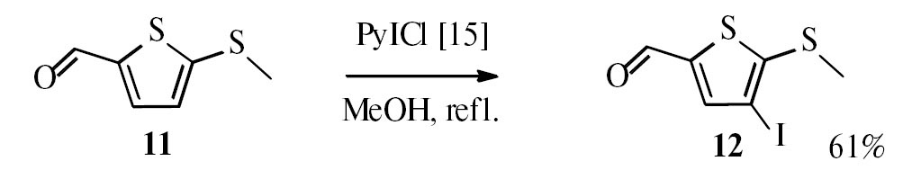 4-Йод-5-(метилтио)тиофен-2-карбоксальдегид (12). К раствору 0.27 г (1.7 ммоль) 5-(метилтио)тиофен-2-карбоксальдегида (11) в 10 мл метанола прибавляли 0.86 г (3.5 ммоль) йодхлорида пиридиния [15]. Реакционную смесь кипятили 3 ч с обратным холодильником, охлаждали до комнатной температуры и выливали в воду. Продукт экстрагировали хлористым метиленом, экстракт сушили CaCl2, растворитель удаляли в вакууме. Твердый остаток растворяли в бензоле и хроматографировали на колонке с SiO2, элюент — смесь бензол–хлороформ, 9 : 1 (об.). Выход 0.3 г (61%), светло-желтые пластинки, т.пл. 125–128°С. ИК спектр (KBr), см–1: 1650 (С=О). Спектр ЯМР 1H (400 МГц, CDCl3), δ, м.д.: 2.63 с (3H, SCH3), 7.64 с (1Нтиофена), 9.67 с (1H, СНО). Найдено: [М]+ 283.8821. C6H5O1I1S2. Вычислено: М+ 283.8819.