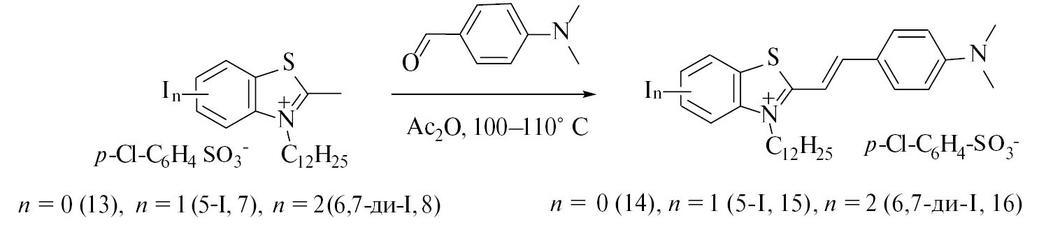 Конденсацией 4-диметиламинобензальдегида с солями бензотиазолия 7 и 8, а также с солью 13, не содержащей йода, синтезированы красители, содержащие до 2 атомов йода в карбоциклическом фрагменте (схема 5).