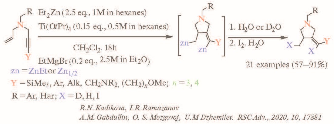 Реакция карбоцинкирования ацетиленов, как один из методов карбометаллирования ненасыщенных субстратов, является эффективным инструментом создания углерод-углеродной связи, позволяющим осуществлять высокоселективное получение ди-, три- и тетразамещенных олефинов [1–9]. Возможность карбометаллирования широкого спектра функционально замещенных алкинов является одной из отличительных характеристик реакции карбоцинкирования ацетиленов [10–14]. Толерантность цинкорганических реагентов к присутствию различных по природе гетерофункциональных заместителей в структуре ацетиленовых молекул демонстрируется множеством примеров получения функционализированных олефинов на основе реакций карбоцинкирования ацетиленов в присутствии соединений переходных металлов [7, 15]. В настоящее время нами также продемонстрирована высокая эффективность Ti-Mg- и Ti-Zr-катализируемых реакций карбоцинкирования алкинов для получения замещенных (1Z)-алкенилфосфороксидов [16], (1Z)-алкенилфосфорсульфидов [17] и (2Z)-алкениламинов [18, 19] линейного и циклического строения. Реакция 2-цинкоэтилцинкирования ацетиленов с помощью Et2Zn, в отличие от других видов карбоцинкирования, является источником построения дицинкорганических интермедиатов с двумя C(sp3)–Zn- и C(sp2)–Zn-связями [16–19]. Получение подобного рода промежуточных металлоорганических соединений с 2 высокоактивными цинк-углеродными связями представляет большой интерес для разработки однореакторных методов получения различных классов органических соединений на основе реакций образующихся in situ цинкорганических интермедиатов с электрофильными реагентами [20, 21]. Таким образом, реакция карбоцинкирования ацетиленов является привлекательным инструментом для конструирования различных по природе олефиновых соединений. Особого внимания заслуживает реакция карбоцинкирования ениновых молекул, так как позволяет осуществить селективное получение гетероциклических соединений. Ранее нами показано, что Ti-Mg-катализируемая реакция N-аллилзамещенных 2-алкиниламинов с Et2Zn приводит к регио- и стереоселективному образованию Z-метиленпирролидинов (схема 1) [18].