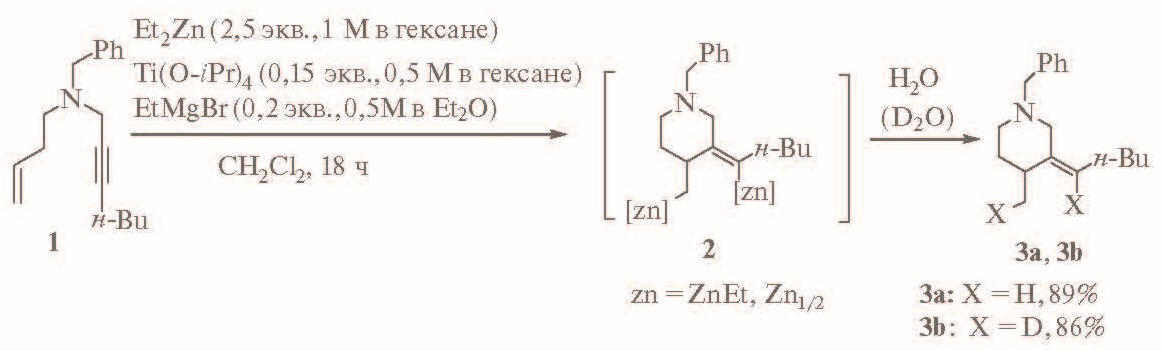Нами установлено, что реакция N-бензил-N-(бут-3-ен-1-ил)гепт-2-ин-1-амина (1) с 2.5 экв. Et2Zn (1 М раствор в гексане) в присутствии 15 мол. % Ti(O-iPr)4 (0.5 M в гексане) и 20 мол. % EtMgBr (0.5 M в Et2O) в растворе хлористого метилена приводит к регио- и стереоселективному образованию (Z)-1-бензил-4-метил-3-пентилиденпиперидина 3a с выходом 89% (схема 2). Структура образующегося замещенного пиперидина также установлена с помощью 1D- и 2D ЯМР спектроскопии продукта дейтеролиза 3b.