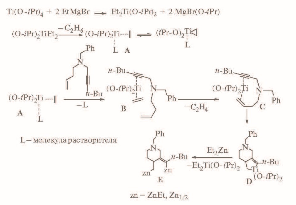 Из полученных данных дейтеролиза следует, что образующееся в ходе реакции промежуточное металлоорганическое соединение 2 содержит дицинкорганический структурный фрагмент с 2 высокоактивными металл-углеродными связями. Согласно предложенной нами схеме реакции (схема 3), реакция лигандного обмена между Ti(O-iPr)4 и EtMgBr дает (O-iPr)2TiEt2, который превращается в титан(II)-этиленовый комплекс A (или титаноциклопропановый интермедиат), который также может быть представлен как эквивалент двухвалентного Ti(O-iPr)2, стабилизированного с помощью этиленового лиганда и молекулы растворителя [26]. Высказано предположение о генерации титаноциклопропанового интермедиата при взаимодействии реактивов Гриньяра с алкоксидами титана(IV) [27]. Последовательное вытеснение енином 1 молекул растворителя и этилена из координационной сферы атома титана приводит к образованию интермедиатных комплексов B и C. Последующее сочетание ацетиленового и этиленового фрагментов молекулы енина 1 дает титаноциклопентеновый интермедиат D, который после переметаллирования с помощью Et2Zn превращается в цинкорганический интермедиат E. Дейтеролиз (или гидролиз) последнего приводит к образованию пиперидинового производного 3.