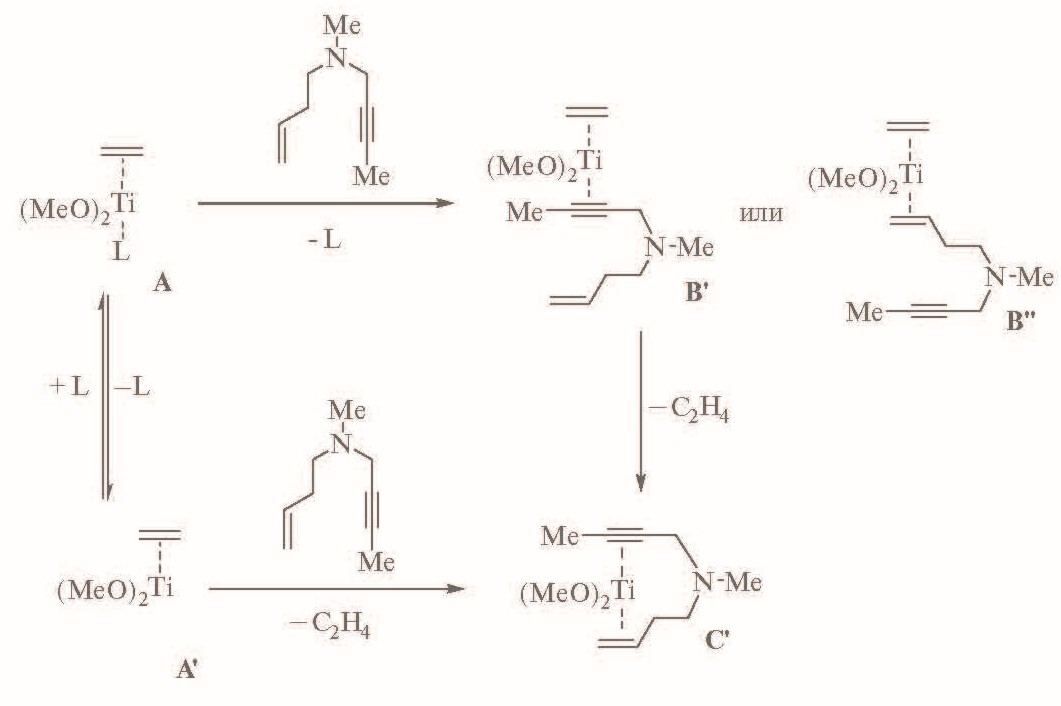 Квантово-химическое моделирование методом B3LYP/6-31G(d,p) стадии вытеснения молекулы растворителя из комплекса A с помощью N-(бут-2-ин-1-ил)-N-метилбут-3-ен-1-амина, который был выбран в качестве модельного соединения, с образованием комплекса В' показывает, что легкость вытеснения растворителя возрастает в ряду Et3N (–3.1 ккал/мол) < ТГФ (–5.2 ккал/мол) < Me2O (–6.4 ккал/моль) < анизол (–8.5 ккал/моль) < < CH2Cl2 (–18.0 ккал/моль) (схема 5). При этом в координации с атомом титана участвует ацетиленовый фрагмент енина. Образование комплекса B'' с участием этиленового фрагмента енина менее выгодно на 11.0 ккал/моль. Согласно квантово-химическим вычислениям, при использовании в качестве растворителя дихлорметана, гексана или ароматических углеводородов (бензол, толуол), равновесие между интермедиатами A и A' смещено в сторону образования несольватированного титаноциклопропана A', что обуславливает легкость образования интермедиата C'.