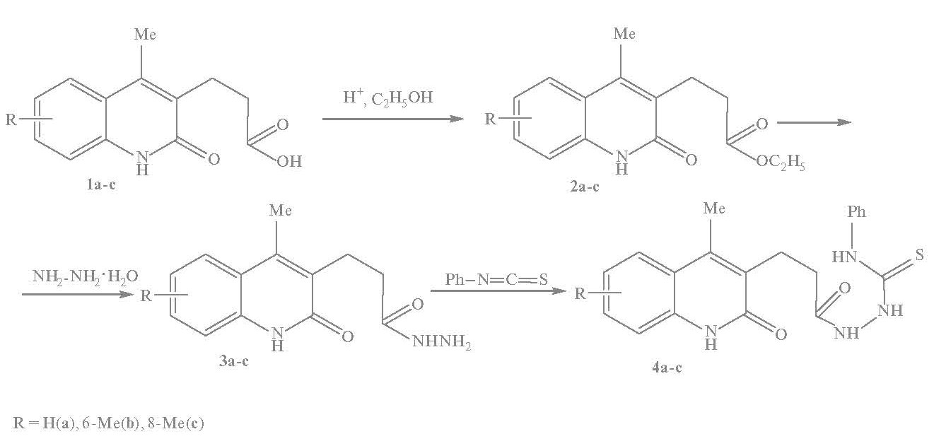 С учетом широкого спектра биологической активности, приписываемой триазолам, тиадиазолам и хинолинам, в данном исследовании казалось целесообразным объединить эти биологически важные фрагменты для создания гетероциклов на основе бензозамещенных 3-(4-метил-2-оксо-1,2-дигидрохинолин-3-ил)пропионовых кислот 1a–c. Процесс начинался с реакции эстерификации бензозамещенных (хинолин-3-ил)пропановых кислот 1a–c с этанолом в присутствии концентрированной серной кислоты в бензольной среде в условиях кипения. Воду из окружающей среды удаляли с помощью водоотделителя в виде азеотропной смеси воды и бензола. О завершении реакции свидетельствовала стабилизация объема воды внутри водоотделителя. Реакция приводила к образованию бензозамещенных этил-3-(4-метил-2-оксо-1,2-дигидрохинолин-3-ил)пропионатов 2а–с с высокими выходами. При взаимодействии соединения 2а–с с гидразингидратом получены бензозамещенные 3-(4-метил-2-оксо-1,2-дигидрохинолин-3-ил)пропаногидразиды 3а–с. В дальнейшем эти гидразиды подвергали взаимодействию с фенилизотиоцианатом с получением соответствующих 2-[3-(4-метил-2-оксо-1,2-дигидрохинолин-3-ил)пропаноил]-N-фенилгидразин-1-карботиоамидов 4a–c (схема 1).