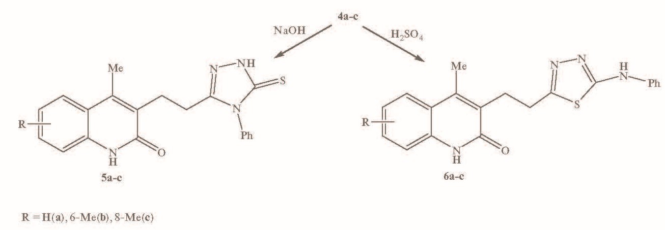 С учетом функционального потенциала полученных фенилгидразинкарботиоамидов 4а–c и с целью создания ряда новых триазолов и тиадиазолов осуществлена внутримолекулярная циклизация N-фенилгидразин-1-карботиоамидов 4a–c с использованием 5%-ного гидроксида натрия и концентрированной серной кислоты. Эта реакция с большими выходами приводила к образованию 4-метил-3-[2-(4-фенил-5-тиоксо-4,5-дигидро-1Н-1,2,4-триазол-3-ил)этил]хинолин-2(1H)-онов 5а–c и 4-метил-3-[2-(5-(фениламино)-1,3,4-тиадиазол-2-ил)этил]хинолин-2(1Н)-онов 6а–c соответственно (схема 2).