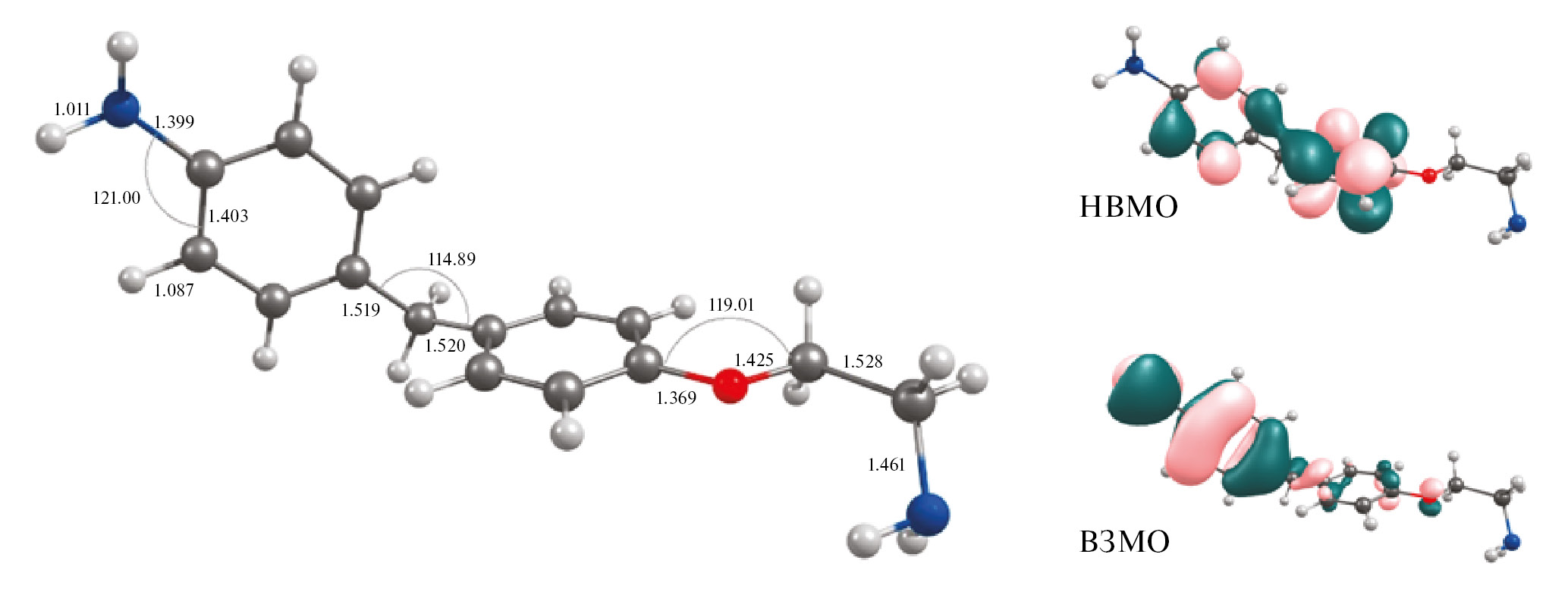Рис. 3. 3D модель 4-[4-(2-аминоэтокси)бензил]анилина (1) и визуализация граничных молекулярных орбиталей (оптимизация молекулярной геометрии выполнена на уровне B3LYP/6-31G(d,p), длины связей указаны в Å)