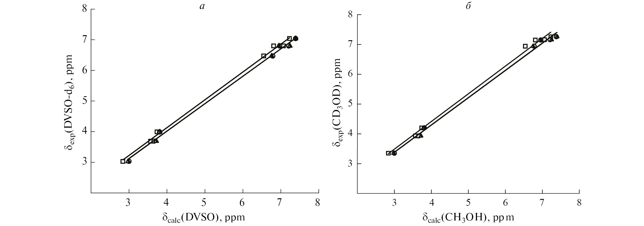 Соотношение между экспериментальными и рассчитанными химическими сдвигами ядер 1Н для 4-[4-(2-аминоэтокси)бензил]анилина с учетом неспецифической сольватации ДМСО и СН3ОН иллюстрирует рис. 4. Параметры a и b полученных линейных зависимостей типа δexp = aδcalc + b, где значения химического сдвига δexp получены экспериментально и δcalc рассчитаны, приведены в табл. 2, 3. Учет влияния растворителя в рамках модели IEFPCM позволяет получить более высокие значения коэффициентов линейной корреляции R. В случае ДМСО наибольшие значения R наблюдаются для уровня теории B3LYP/6-31G(d,p), а для СН3ОН – B3LYP/6-31+G(d,p).