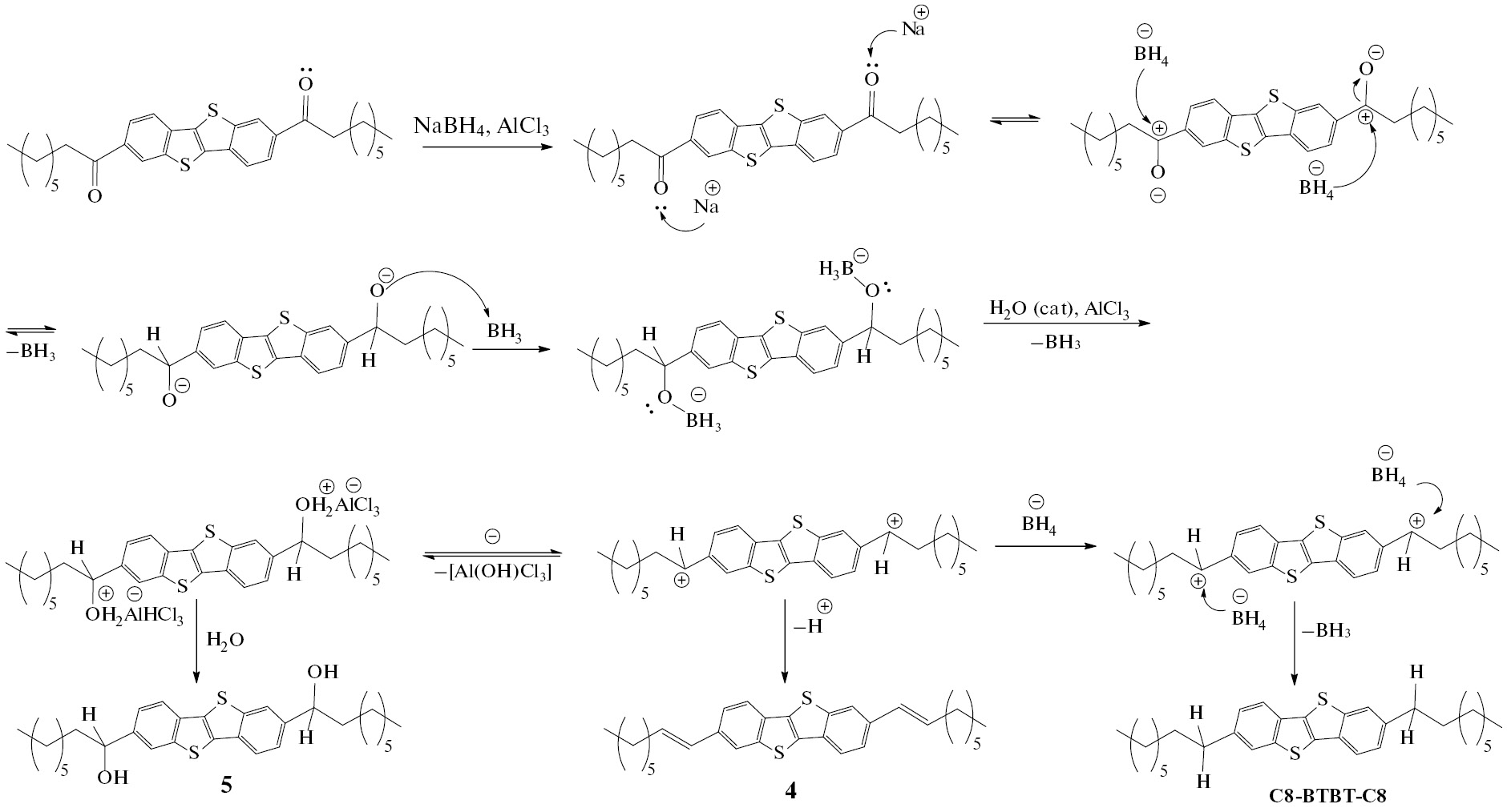 На первом этапе происходит атака кислорода солюбилизированным ионом натрия с разрывом двойной связи и образованием положительного заряда на карбонильном углероде. Затем происходит нуклеофильное присоединение гидрид—аниона от к электрофильному центру с последующим образованием органоборного производного [35] за счет образования связи кислород–бор. Наличие каталитического количества воды в реакции приводит к замещению связи O—B на связь О–Н, а AlCl3, являясь сильной кислотой Льюиса, образует комплекс с кислородом с последующим отщеплением иона состава [Al(OH)Cl3]—, что приводит к образованию карбокатиона, который в условиях недостатка боргидрид-аниона, способен самопроизвольно выбросить протон с образованием побочного диалкена 4. Такой процесс протекает очень быстро и является типичным примером реакции мономолекулярного элиминирования. С другой стороны, полученный карбокатион способен присоединить еще один гидрид—анион с образованием целевого соединения C8-BTBT-C8 [32, 35].