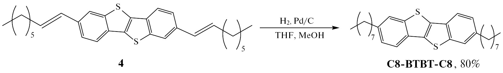 Поскольку в результате реакции образовалась смесь целевого C8-BTBT-C8 и побочного соединения 4 в примерном соотношении 1 : 1, то для увеличения выхода была проведена реакция гидрирования соединения 4. В качестве восстановителя использовали водород на палладиевом катализаторе, при пропускании водорода через раствор исходного 2,7-ди(окт-1-ен-1-ил)бензо[b]бензо[4, 5]тиено [2,3-d]тиофена в смеси ТГФ–метанол (5 : 1) при комнатной температуре в течение 30 ч удалось получить целевой C8-BTBT-С8 с выходом 80% (схема 4).
