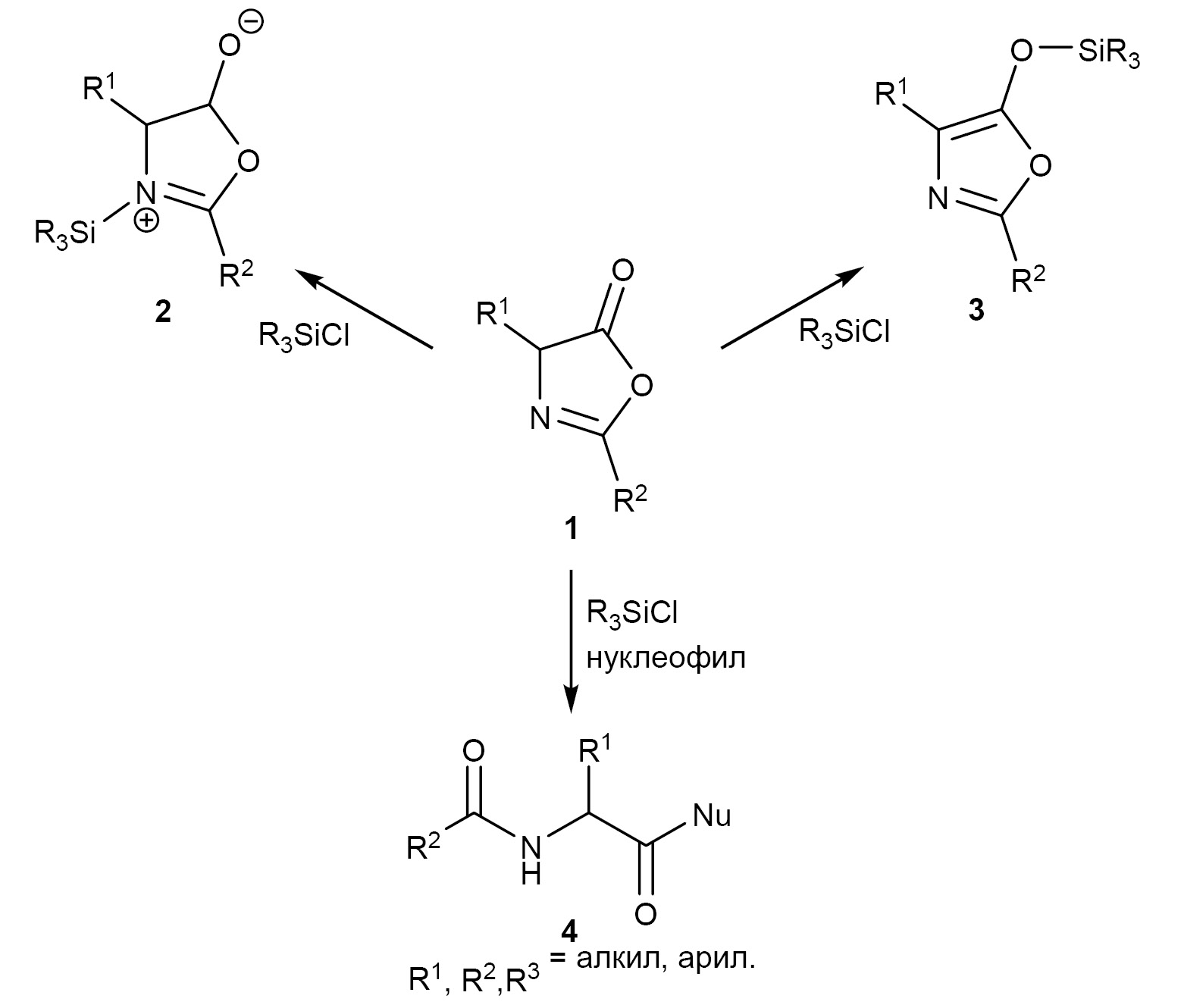 О-Замещенные продукты оксазолонов – силилоксиоксазолы 3 – также являются хорошими синтонами для синтеза различных классов соединений. В некоторых реакциях хлорсиланы способствуют проявлению нуклеофильной природы оксазолона 1 при образовании производных α-аминокислот 4 (схема 1).