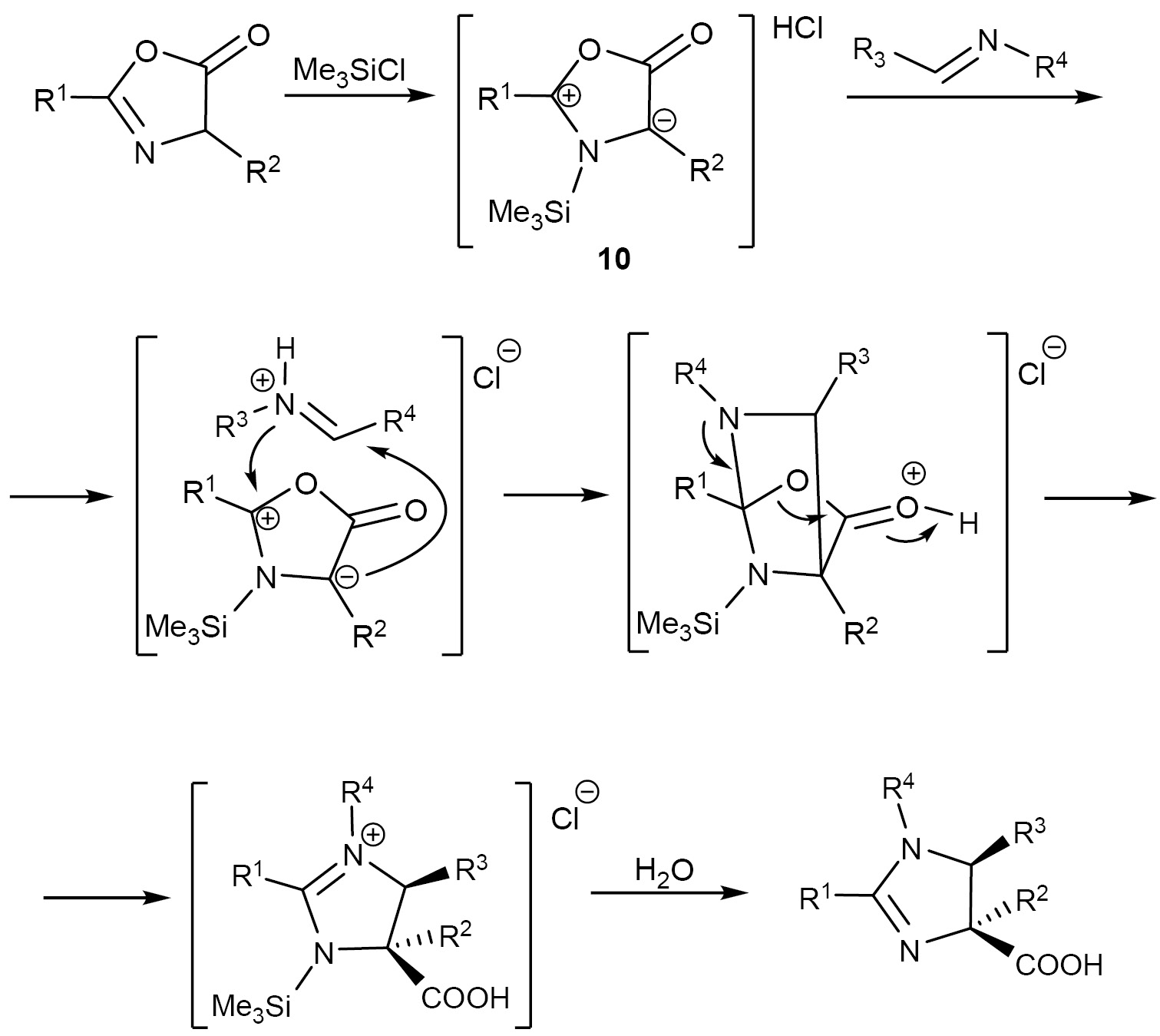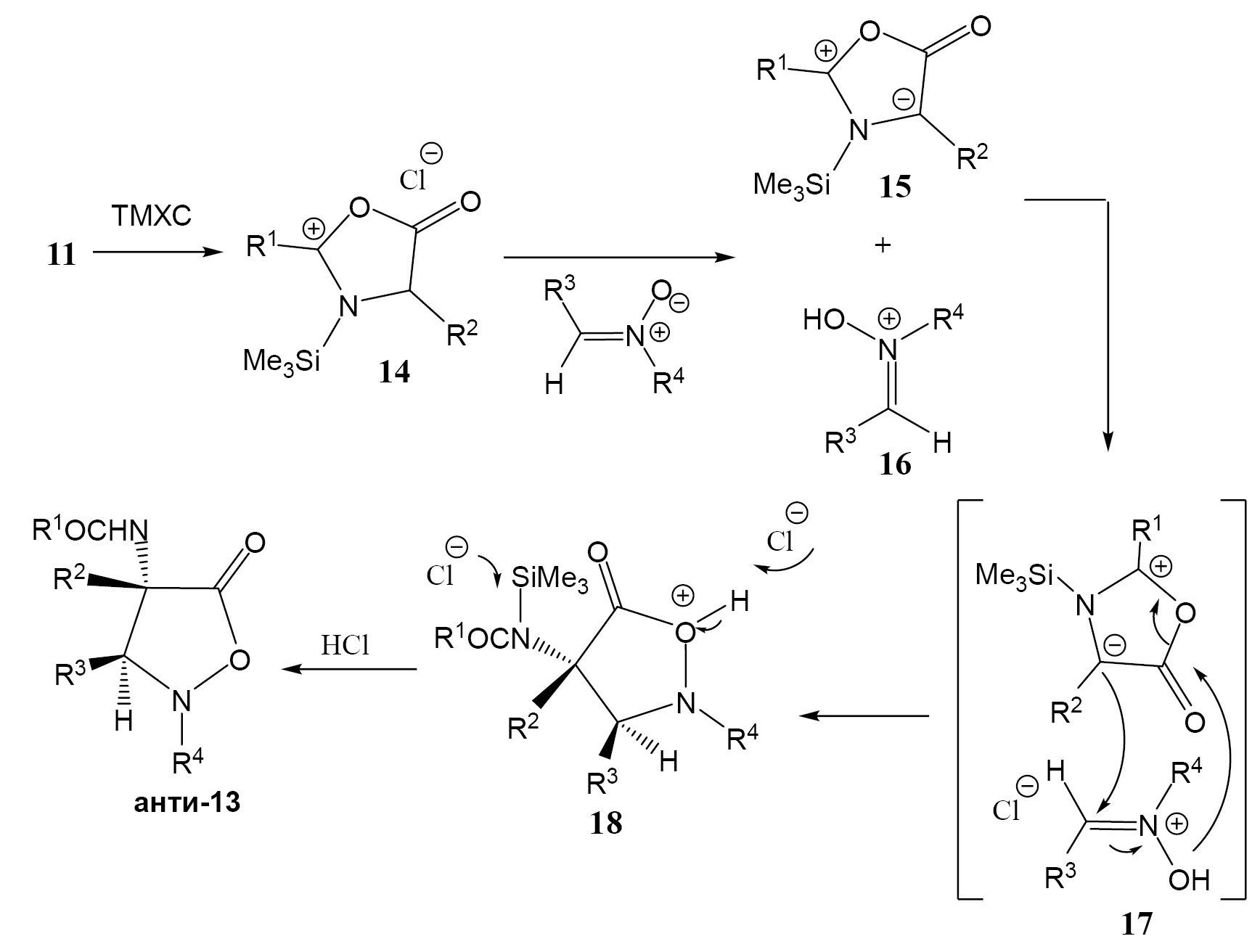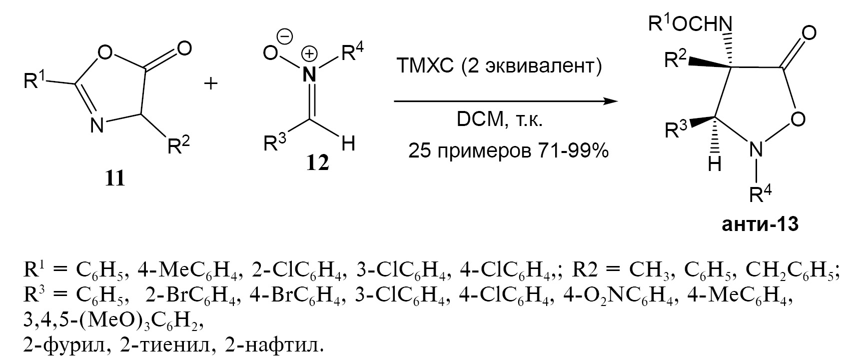 В присутствии таких кремнийорганических реагентов, как ТМХС или ТМСТф, протекает реакция [3+2]-циклоприсоединения насыщенных 5(4Н)-оксазолонов 11 с нитронами 12 с образованием изоксазолидин-5-онов 13 с анти-конфигурацией (схема 5) [13]. Установлено, что наилучшие выходы (71–99%) получаются при применении ТМХС в дихлорметане. Полученные данные свидетельствуют о том, что заместители как в оксазолоне 11 (R1, R2), так и в нитроне 12 (R3, R4) влияют на выход реакции [3+2]-циклоприсоединения. Как правило, реакции 2-фенил-5-оксазолонов 11 (R1 = Ph) с нитронами, содержащими в бензольной группе электроноотрицательные заместители (12: R3 = C6H4 с 3-Br, 3-Cl, 4-Br, 4-Cl, 4-NO2 заместителями), по сравнению с нитронами, в которых R3 = 4-метил- или 4-метоксифенильные фрагменты, приводят к сравнительно высоким выходам оксазолидонов 13. Между тем реакция циклоприсоединения 2-фенил-5-оксазолонов (11: R1 = C6H5) лучше протекает с нитронами 12, имеющими в положении 1 нафтильную (12: R3 = нафтил) или стерически менее объемистую метильную (R4 = Me) группу в положении 2 нитрона 12. Реакции циклоприсоединения препятствовали фенильная (R4 = Ph) и этильная (R3 = Et) группы в положениях 1 и 2 реагента 12.