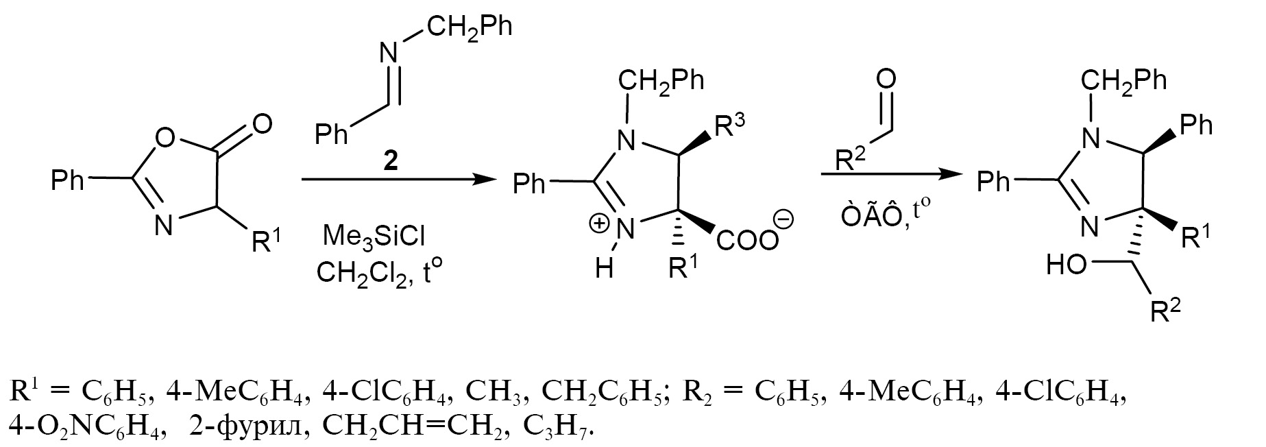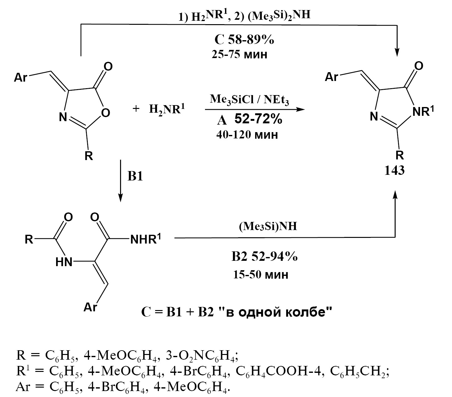 Возможность насыщенных 5(4Н)-оксазолонов участвовать в качестве 1,3-диполярных агентов в реакциях циклоприсоединения использовали при разработке метода синтеза мультизамещенных имидазолов 7 [1–5]. Реакция 5(4Н)-оксазолона 5 с енаминами 6 в присутствии триметилхлорсилана (ТМХС) (схема 2, путь А) в дихлорметане приводит к целевым имидазолам 7 с хорошими выходами. Процесс является высоко диастереоселективным. Исследования, посвященные возможности применения других силилорганических соединений [2], показали, что триэтилхлорсилан (ТЭХС) почти не уступает ТМХС, в то время как трифенилхлорсилан менее активен, а триметилсилиловый эфир трифторметилсульфокислоты (ТМСТф) не эффективен в качестве кислоты Льюиса для катализа этой реакции.