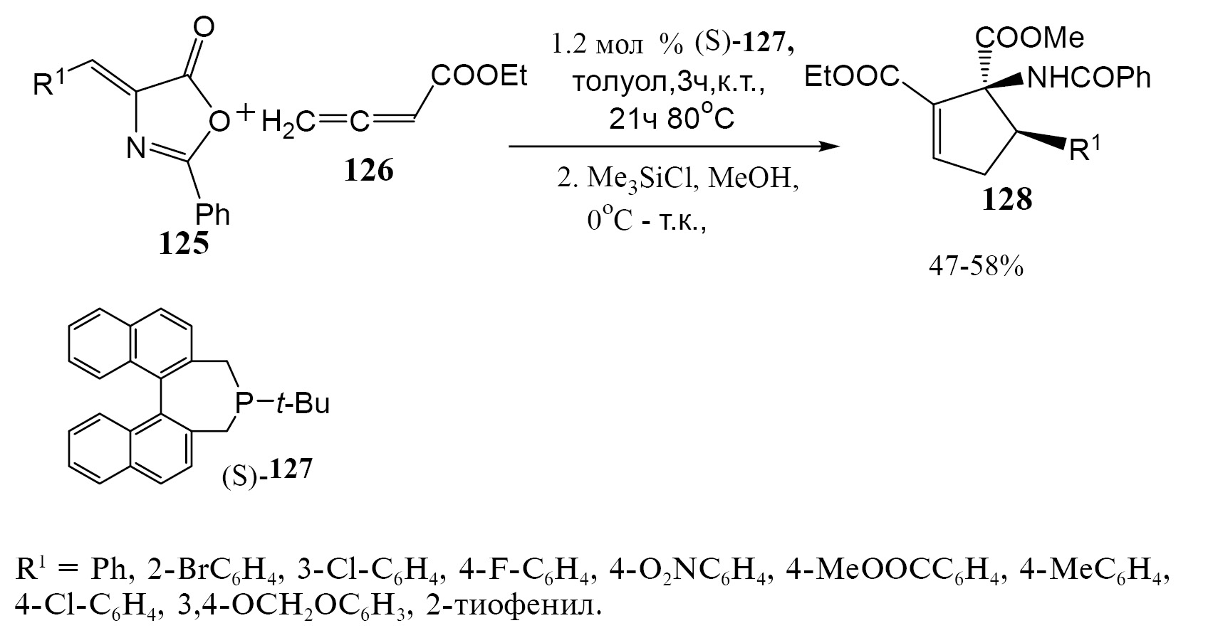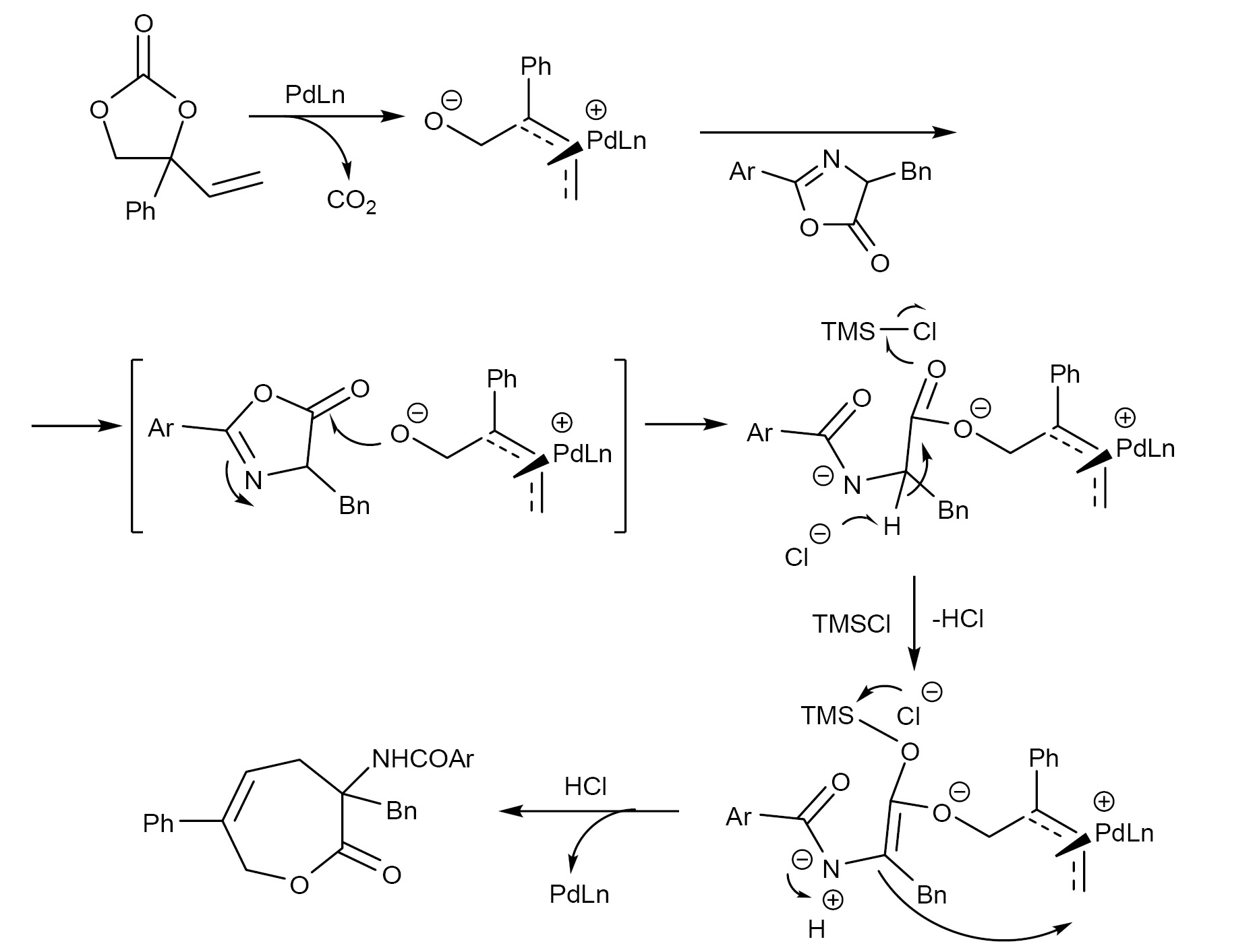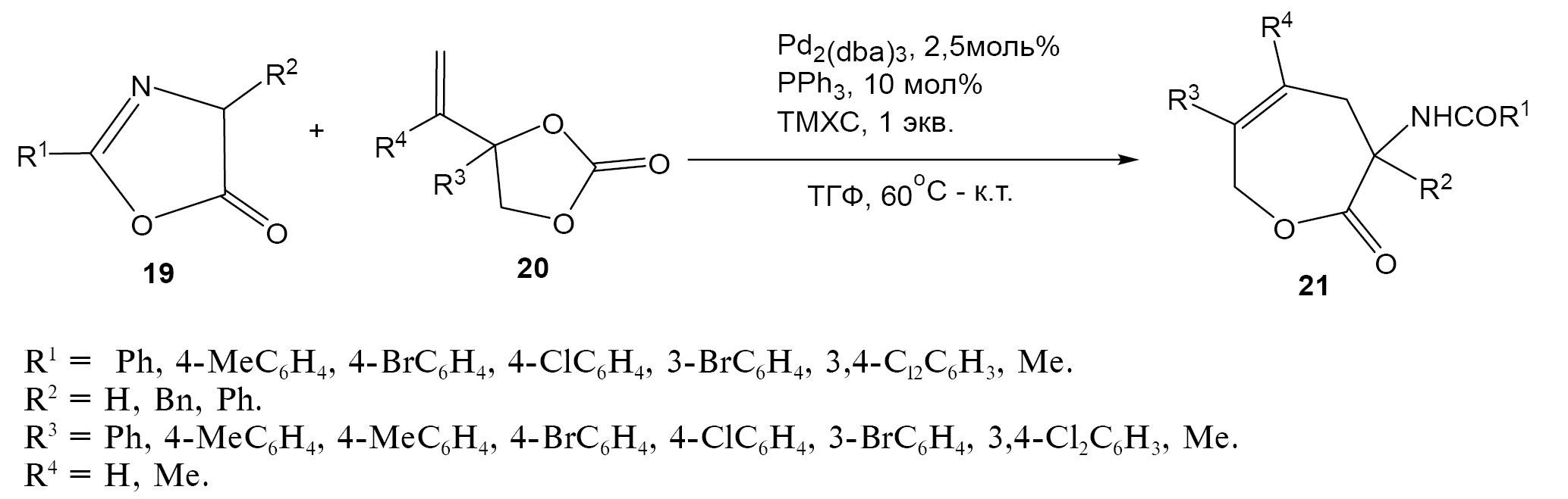 Изучена [14] реакция насыщенных 5(4Н)-оксазолонов 19 с 4-винилэтиленкарбонатами 20. При этом установлено, что в присутствии ТМХС катализируемый смесью трис(дибензилиденацетон)дипалладия (Pd2(dba)3) и трифенилфосфи на процесс протекает с [5+2]-циклоприсоединением с выходами 67–99% лактонов 21 (схема 7).