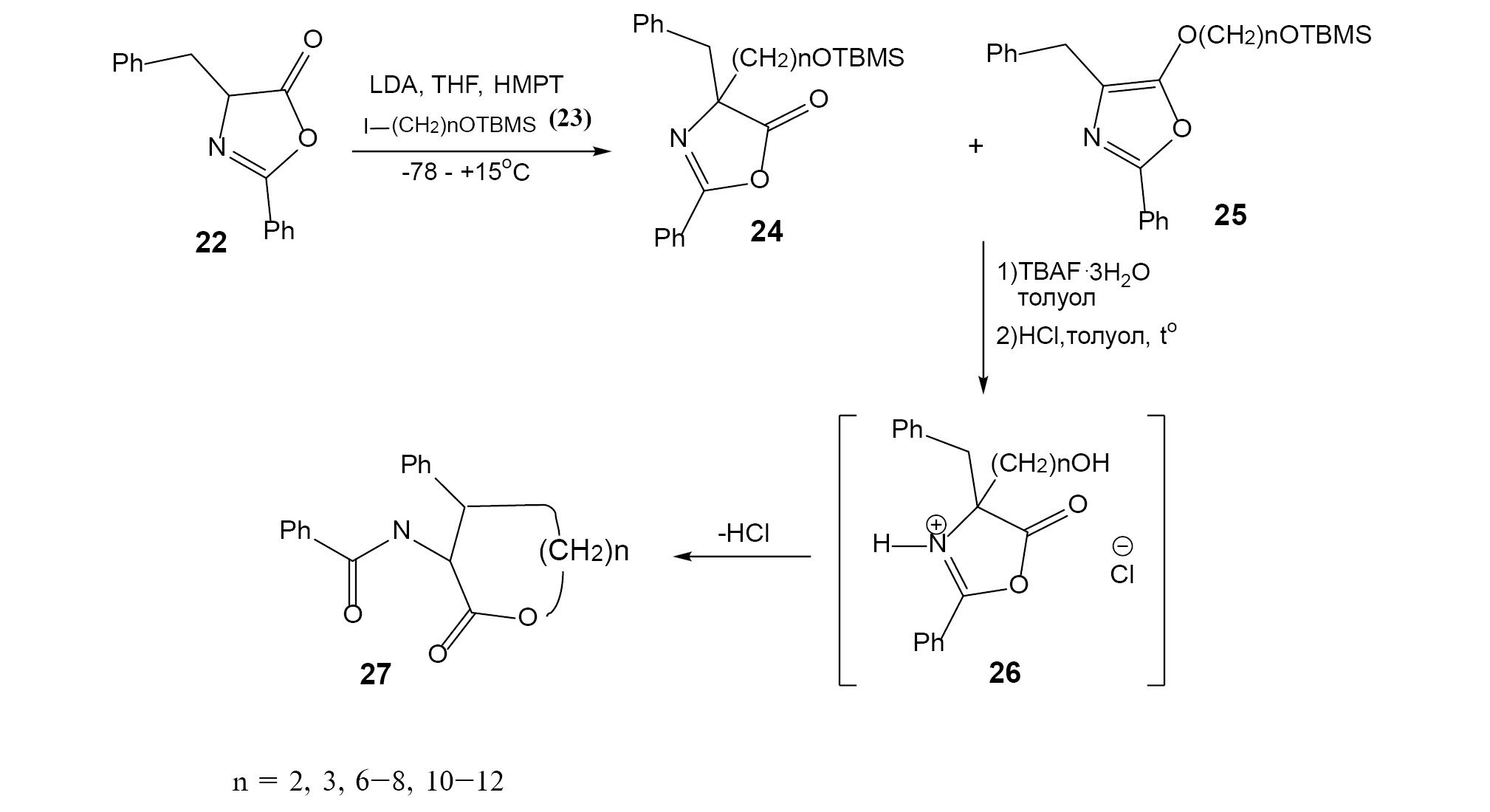 Взаимодействие насыщенного 5(4Н)-оксазолона 22 с ω-{[трет-бутилдиметилсилил]окси}-1-алкилйодидами 23 в присутствии литиевой соли ди-трет-бутиламина (LDA) и трис(диметиламино)фосфина (HMPT) приводит к образованию смеси С- и О-алкилированных продуктов 24 и 25, в которой С-алкилированный изомер 24 преобладает (схема 9) [15].