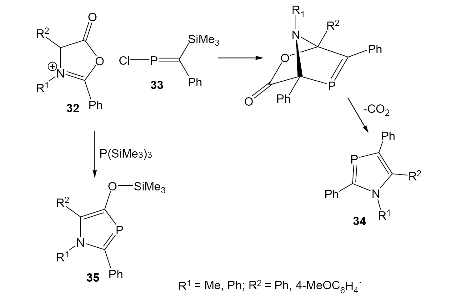 N-Замещенные насыщенные 5(4Н)-оксазолоны 32 (мюнхеноны) с 1-хлор-2-фенил-2-триметилсилилфосфаном (33) вступают в реакцию [3+2]-циклоприсоединения с образованием азафосфолов 34 [17]. Замена реагента 33 на трис-триметилсилилфосфин приводит к азaфосфоленам 35 (схема 11) [18].