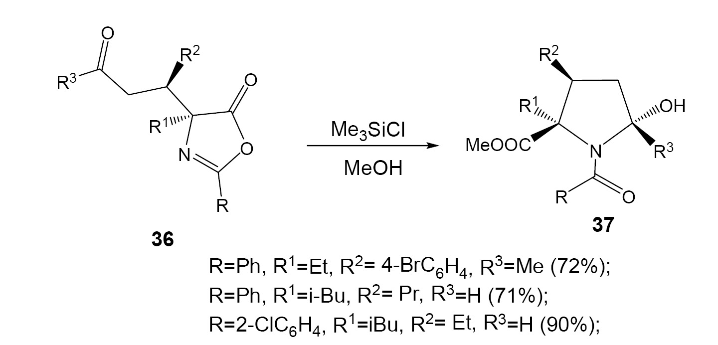 5(4Н)-Оксазолоны, содержащие в положении 4 цикла β-альдегидную (36: R3 = H) [19] или β-кетонную (36: R4 = Ме) группу [20–22], в метаноле и в присутствии ТМСХ при комнатной температуре образуют метиловые эфиры пролина 37 в виде одного диастереомера (схема 12).