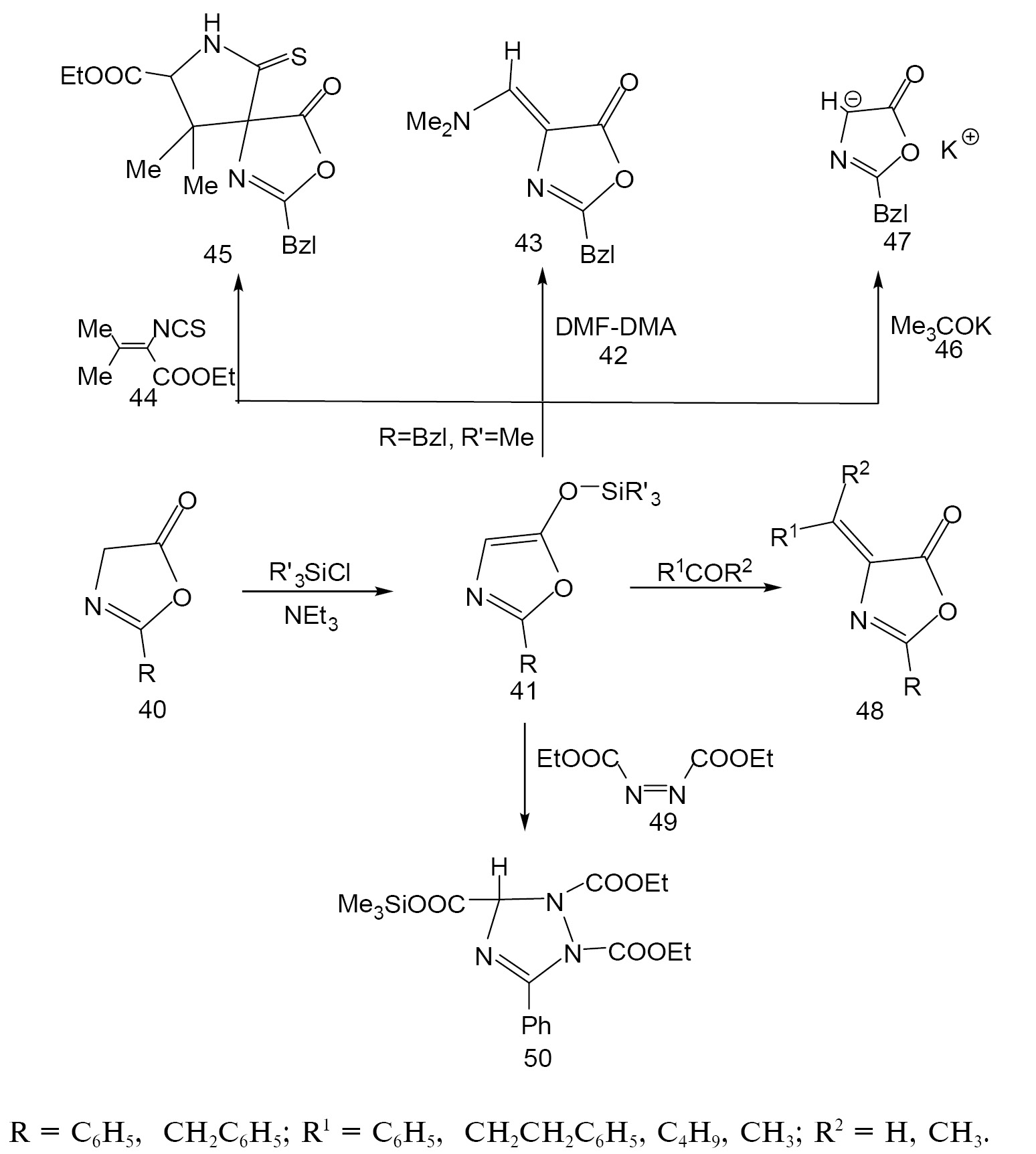 Реакция силилоксазола 41 с калиевой солью трет-бутилового спирта (46) приводит к аниону 47 (схема 14). O-Силилоксазол 41 применяли также для синтеза ненасыщенных 5(4Н)-оксазолонов 48 (схема 14) [24].