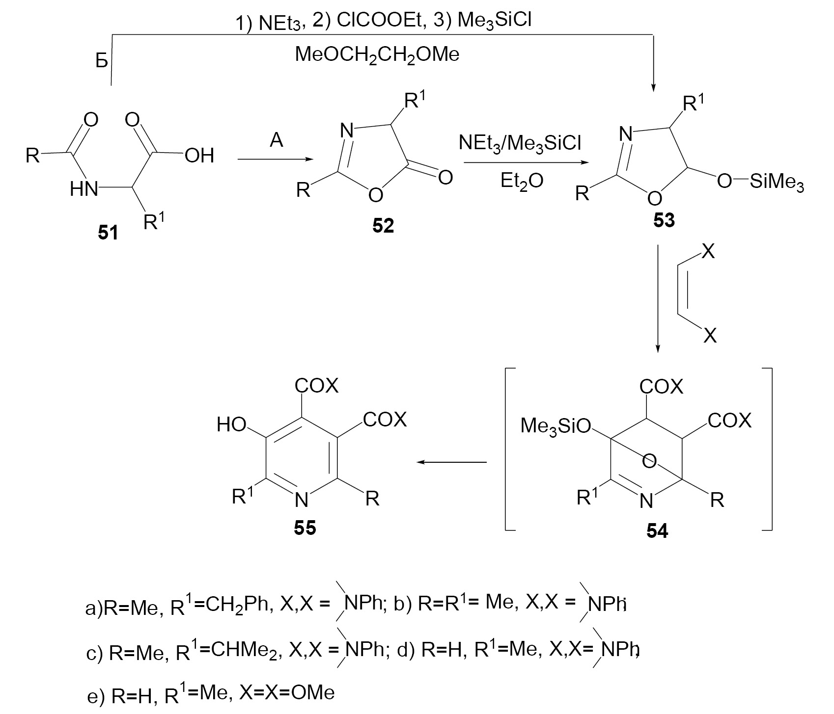 Там же изучена возможность применения соединения 53 в качестве диенов в реакции Дильса–Альдера с N-фенилмалеинимидом или диметиловым эфиром малеиновой кислоты. При этом установлено, что аддукт 54 нестабилен и без выделения разлагается с помощью силикагеля. Таким образом, производные пиридина 55 получены с высокими выходами (83–90%).