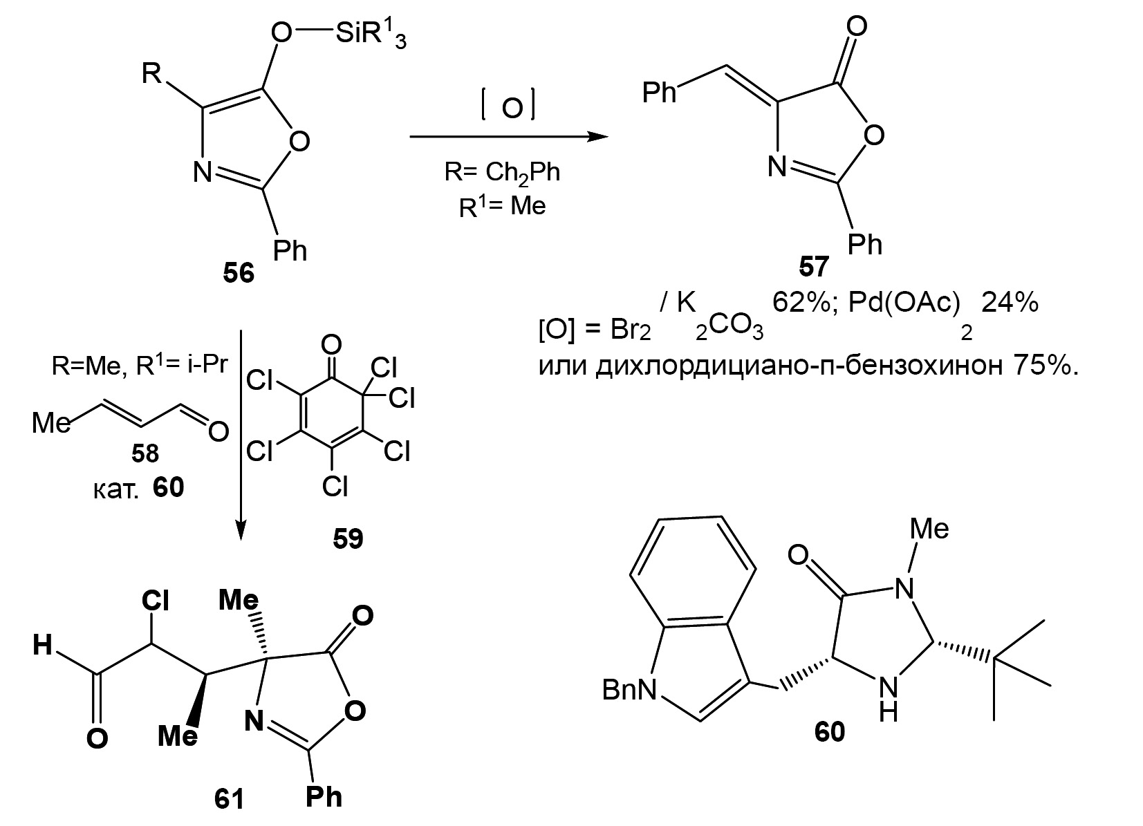 Согласно [27], силилированный 2-фенил-4-бензил-5(4Н)-оксазолон (56: R = CH2Ph, R1 = Me) подвергается окислению с образованием соответствующего ненасыщенного оксазолона 57 в присутствии различных окислителей (схема 16).