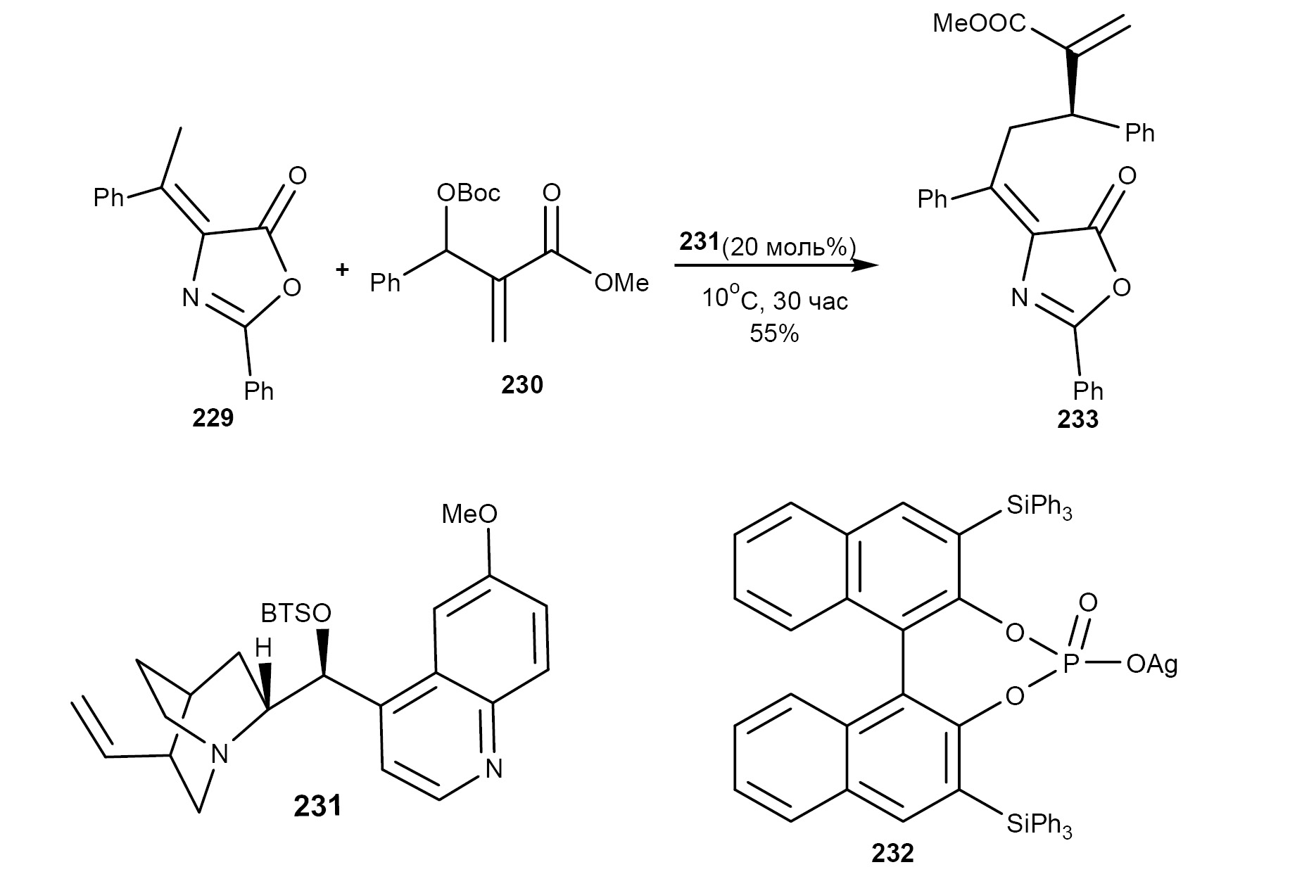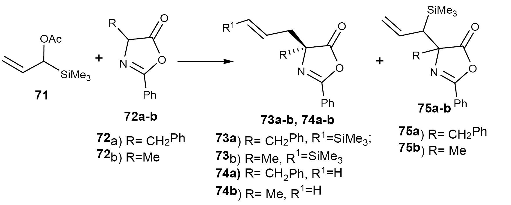 Реакция 2-фенил-4-бензил-5-оксазолона (72a) с 3-ацетокси-3-триметилсилилпропеном (71) в присутствии каталитических количеств лиганда 77 и [η3-C3H5PdCl]2 (76) приводит к образованию силилированного оксазолона 73а с выходом 69% (ee 98%) [30]. При этом получается также десилилированный продукт 74a с выходом 27%, но энантиомерный избыток составляет всего 13% (схема 19). В этом случае не обнаружен аллилированный продукт 75а. С менее затрудненным азлактоном 72b наблюдалась более сложная смесь продуктов.