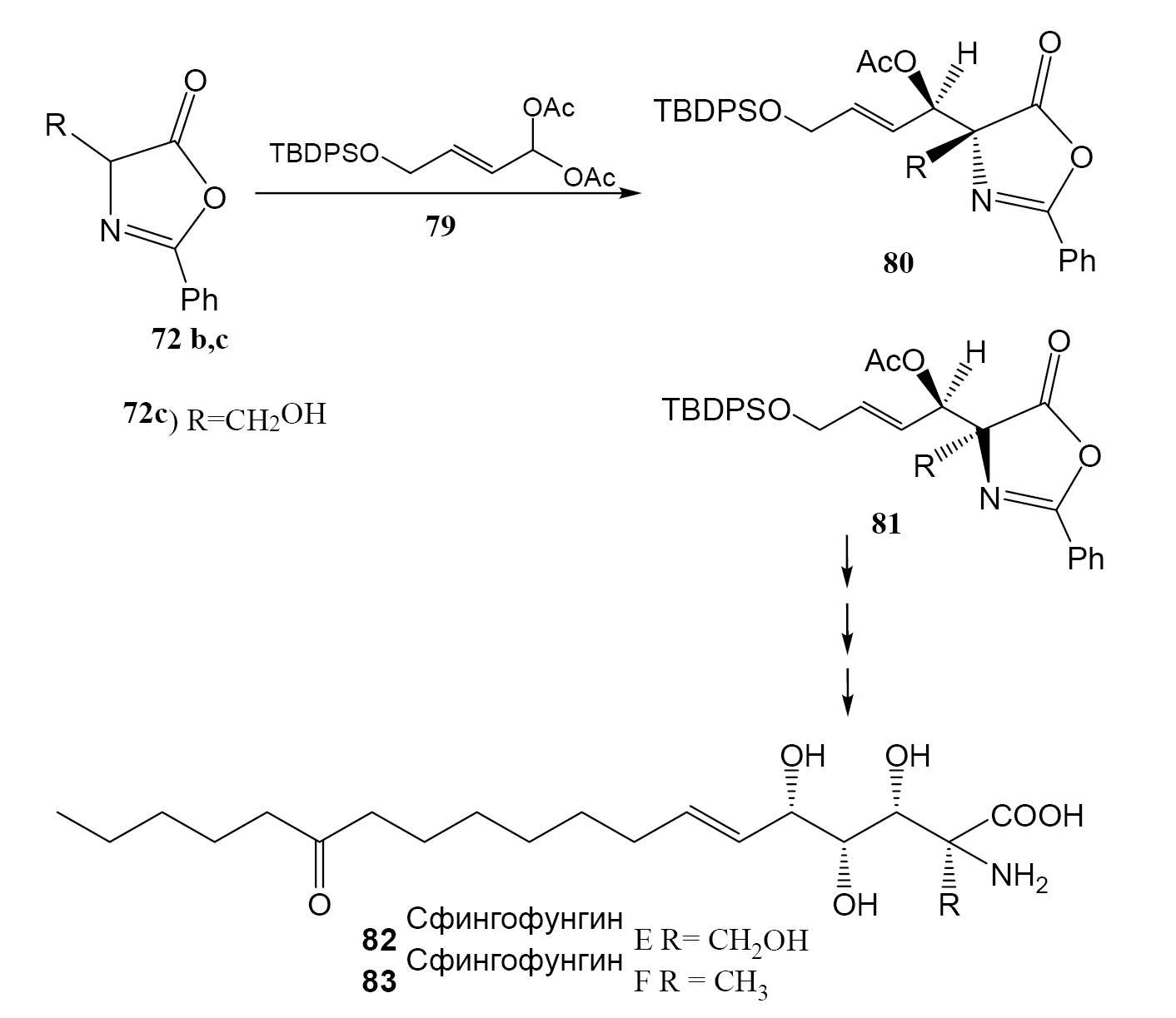 Продукты реакции Pd-катализируемого алкилирования насыщенных 5(4Н)-оксазолонов 72b,c с гем-диацетатом 79 были применены при синтезе сфингофунгинов E и F (схема 20) [31, 32]. Алкилирование оксазолонов 72b,c осуществлено в присутствии таких каталлизаторов, как Pd(PPh3)4 или димер аллилпалладия хлорида (76, (η3-C3H5PdCl)2) совместно с лигандом (1R,2R)-N,N’-(циклогексан-1,2-диил)бис(дифенилфосфино)бензамидом (77). При этом получили 2 стереоизомера 80 и 81. Последний был использован как исходное вещество для многостадийного синтеза сфингофунгинов 82 и 83 (схема 20).