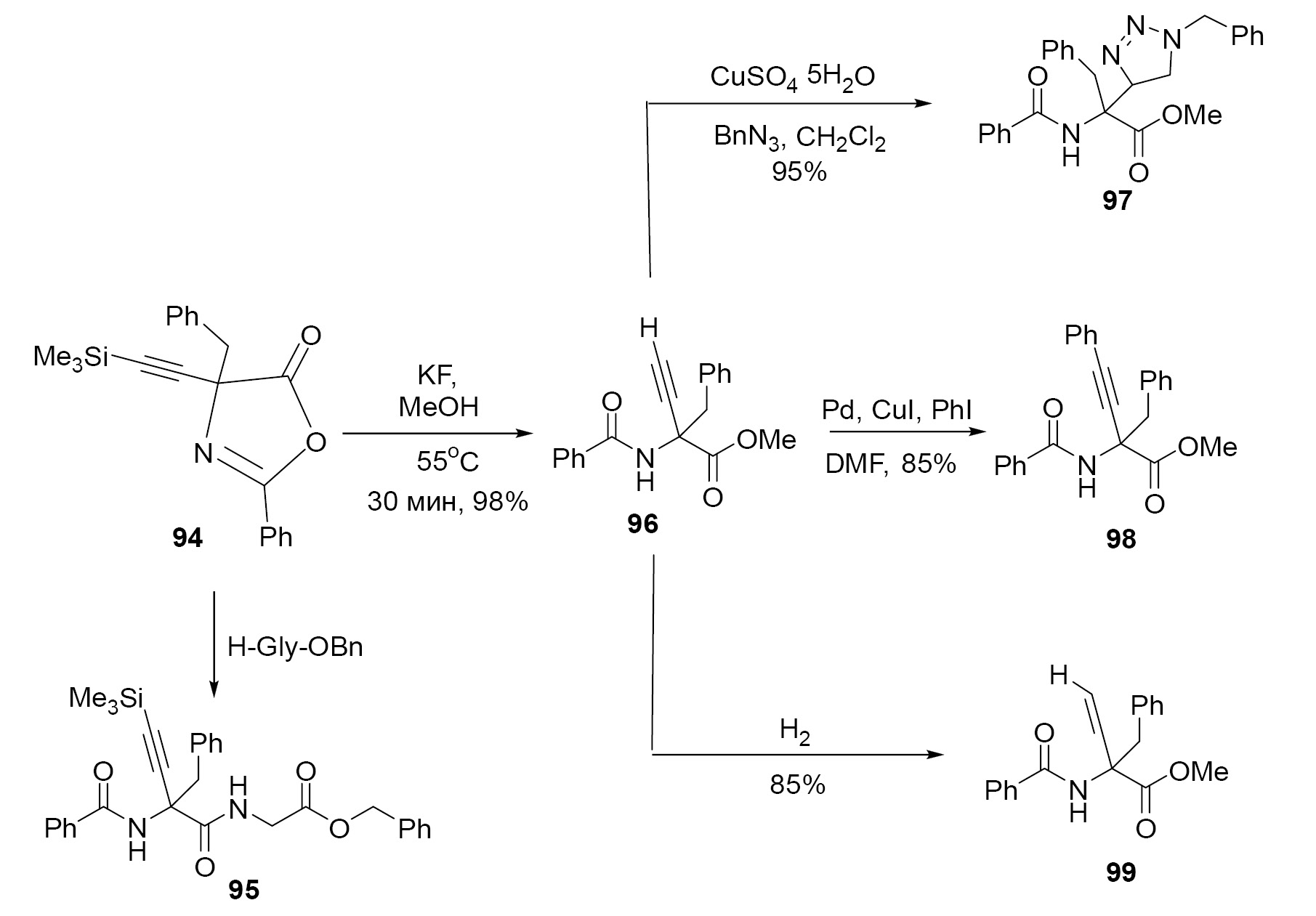 При этом установлено [35], что в присутствии реагента 90 и диизопропилэтиламина 2-фенил-4-изобутил-5(4Н)-оксазолон (92: R = CH2CHMe2) происходит образование силилированного продукта 93 (R = CH2CHMe2) с высоким выходом (96%), тогда как замена реагента 90 на 91 приводит к десилилированному продукту 93 с R1 = H. Показана [35] пригодность силилсодержащих 4-алкинил-5-оксазолонов (94) в качестве исходных соединений для синтеза различных α,α-дизамещенных α-аминокислот 96–99 и пептида 95 (схема 24).