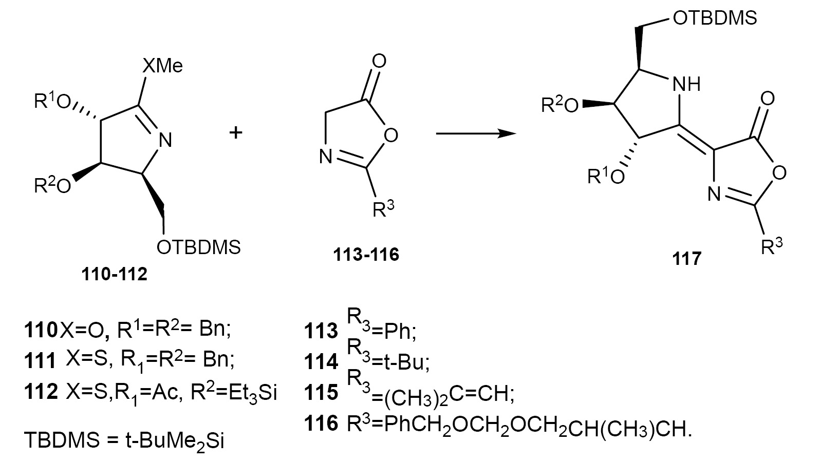 Аналогичная реакция с участием пиррола 112 с 2-[(Е)-2-(бензилоксиметил)метилпропенил]-4H-оксазол-5-оном (116) в смеси толуол-пиридин приводит к соответствующему оксазолону 117 Е-конфигурации с выходом 47%, тогда как та же реакция с участием Z-изомера оксазолона 116 приводит к смеси оксазолона 117 (R = PhCH2OCH2OCH2CH(CH3)=CH, R1 = Ac, R2 = Et3Si), содержащего 9,3% Z-изомера и 32% E-изомера оксазолона 117- [42].