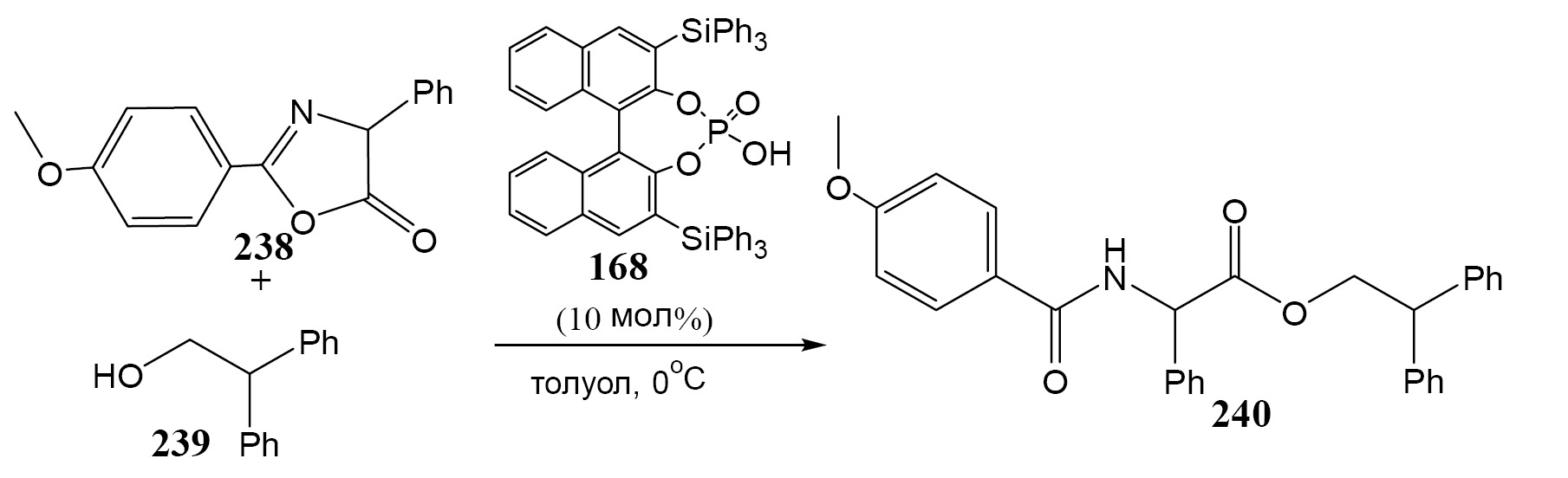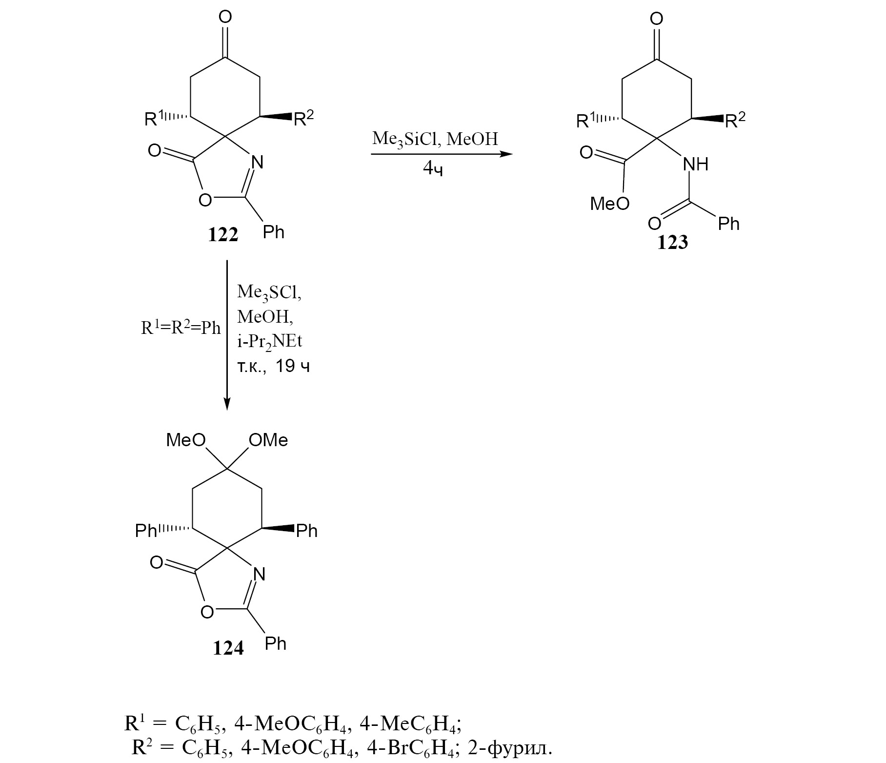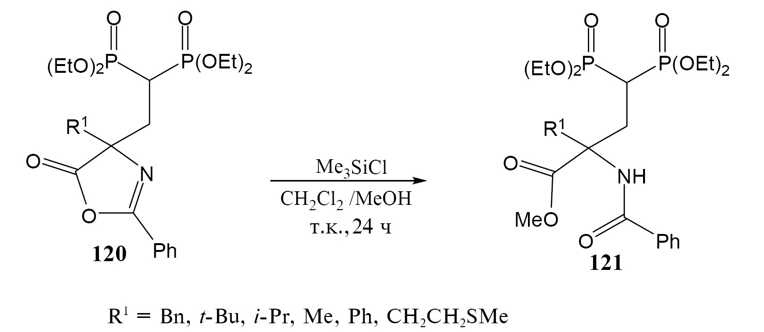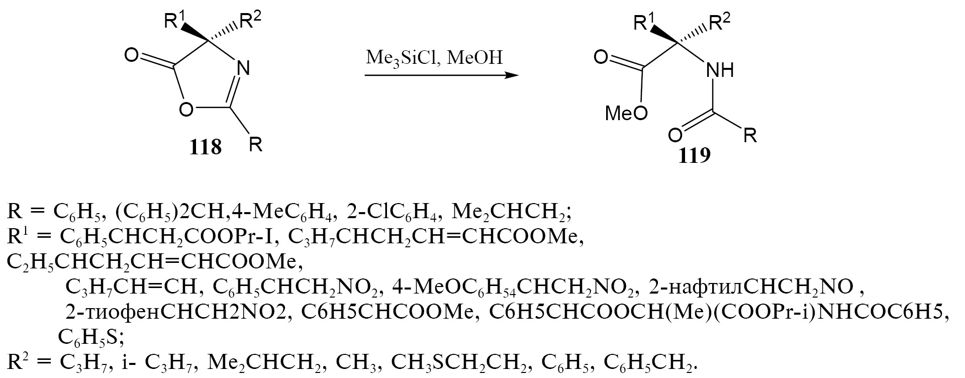 Реакция алкоголиза 4,4-дизамещенных 5(4Н)-оксазолонов 118 в присутствии ТМХС была применена для синтеза α,α-дизамещенных α-аминокислот 119 (схема 28). Реакция, как правило, протекает в мягких условия (комнатная температура) с высокими выходами (50–99%) с сохранением оптической чистоты исходных оксазолонов [19, 20, 22, 30, 43–47].