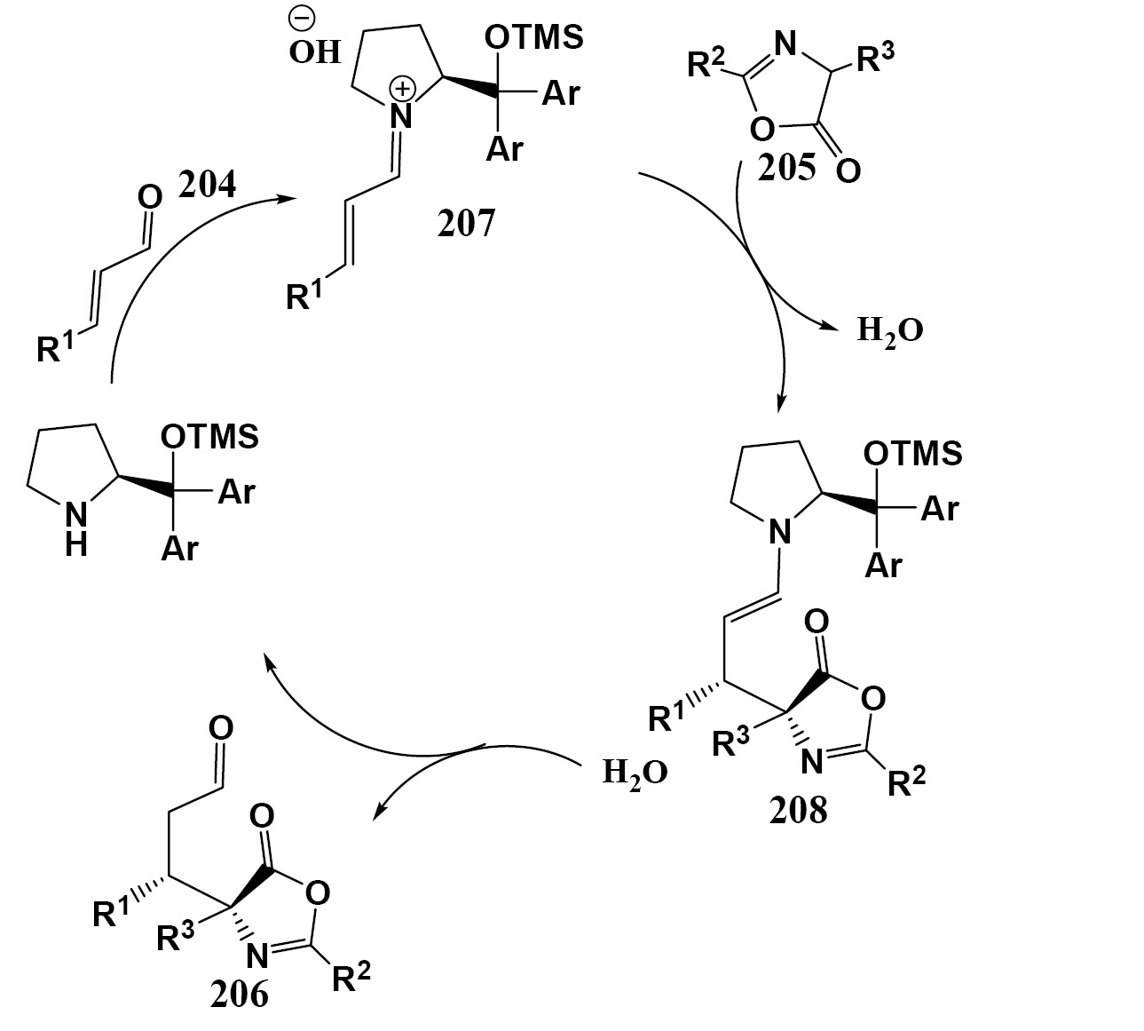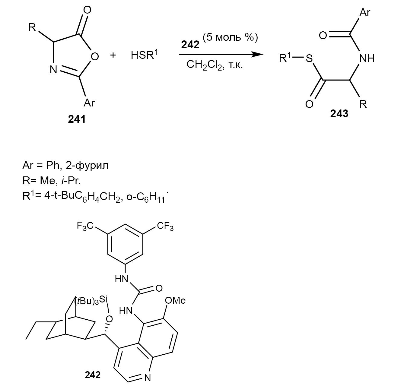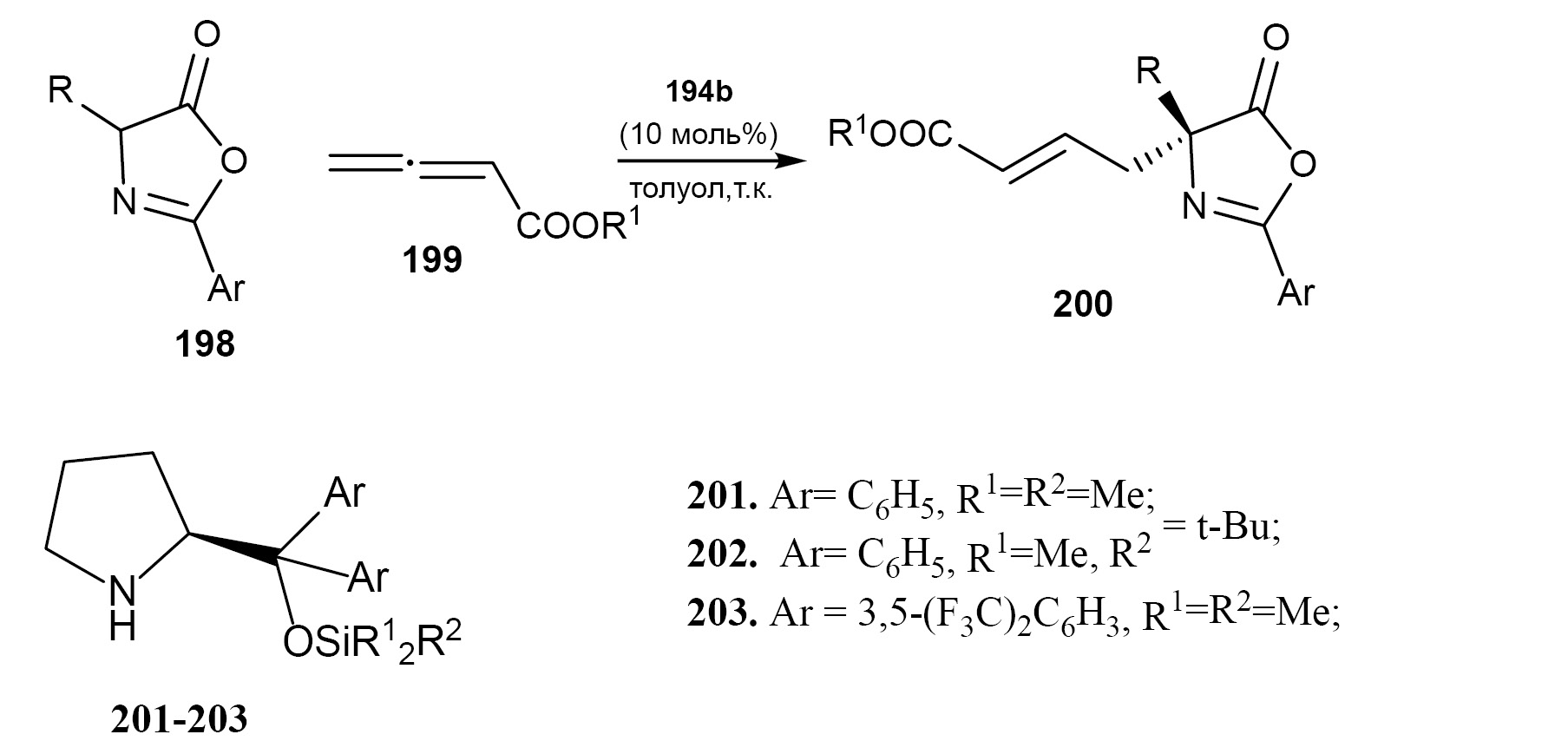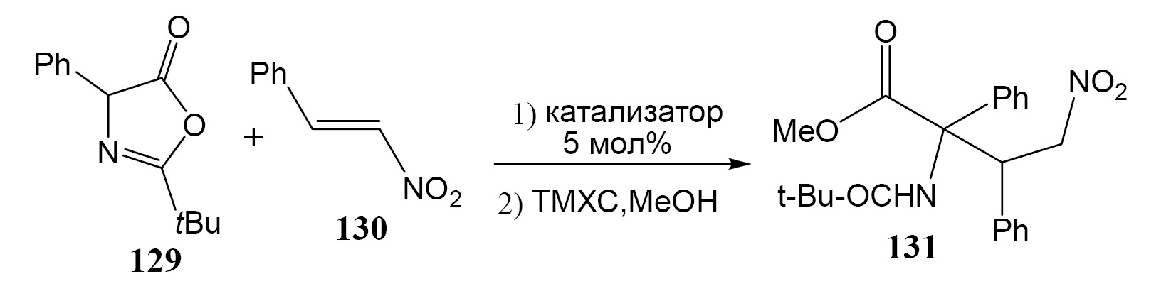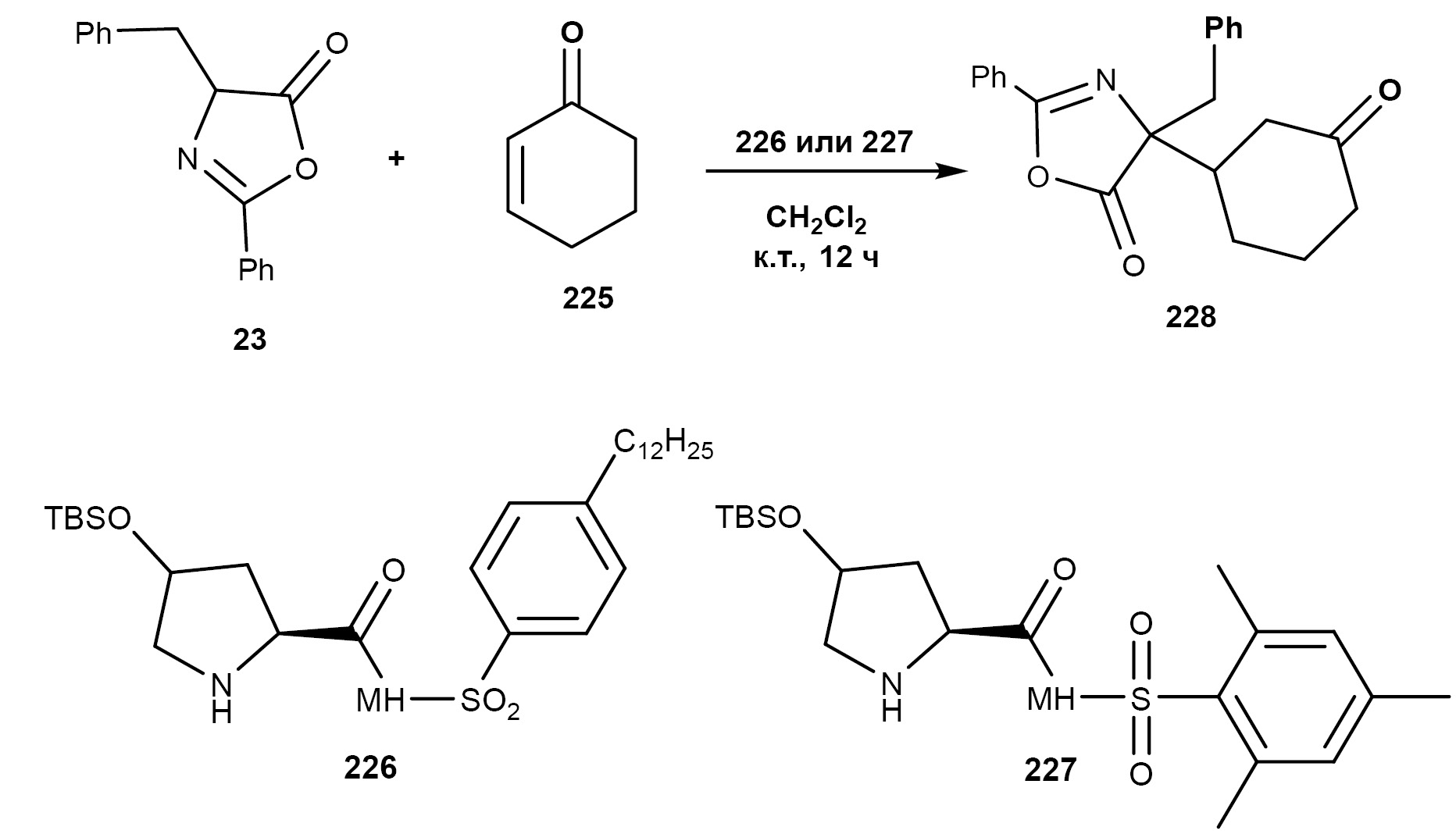 Показано [38], что реакция 4-замещенных оксазолонов 104 с 4-метил-4-((триметилсилил)окси)пент-1-ен-3-оном (105) в присутствии органокатализаторов 108 или 109 после десилилирования полученных аддуктов алкилирования приводит к 4,4-дизамещенным оксазолонам 106 с высокими выходами и оптической чистотой (схема 26).