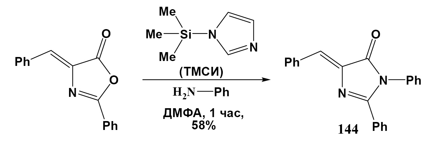 В случае взаимодействия О-силилоксазола 68 с ДМАК в присутствии метилового эфира трифторсульфокислоты (TFOMe) и CsF получен пиррол 69, тогда как реакция О-силилоксазола 68 с тиобензофеноном в тех же условиях приводит к образованию тиоамида 70 (схема 18) [29].