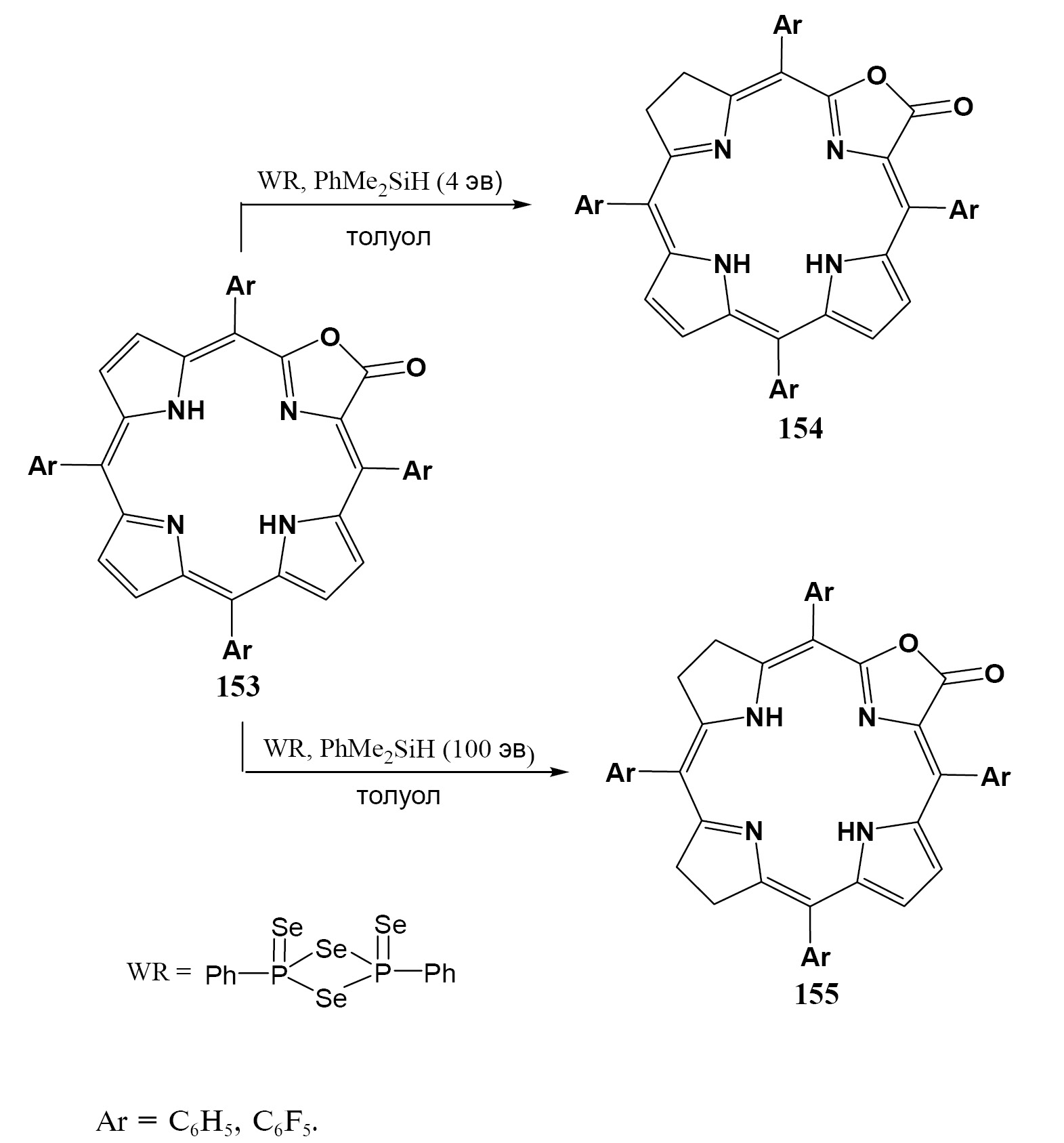При многостадийном синтезе карзинофиллина (азиномицина В – противоопухолевого антибиотика) [39–42] реакцией пирролов 110–112 с 5(4Н)-оксазолонами 113–116 установили, что нагревание пиррола 110 с 3 эквивалентами оксазолона 114 при 80оС в толуоле приводит к ненасыщенному оксазолону 117 (R = Ph, R1 = R2 = Bn) с выходом 33%. Однако при замене пиррола 110 на пиррол 111 (где X = S) выход реакции возрастает до 82% (схема 27) [39, 41]. При этом получается смесь, содержащая Z- и E-изомеры оксазолона 117.