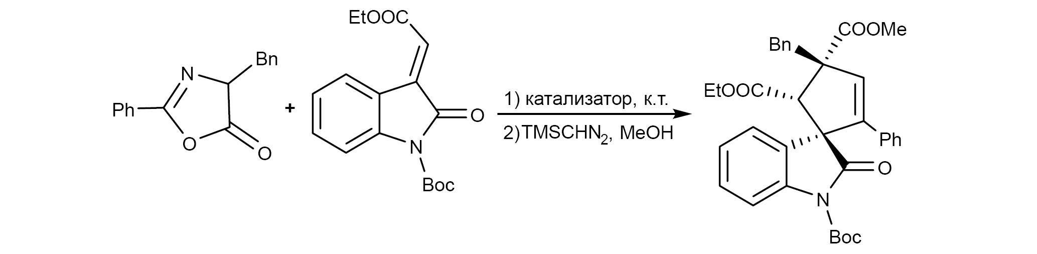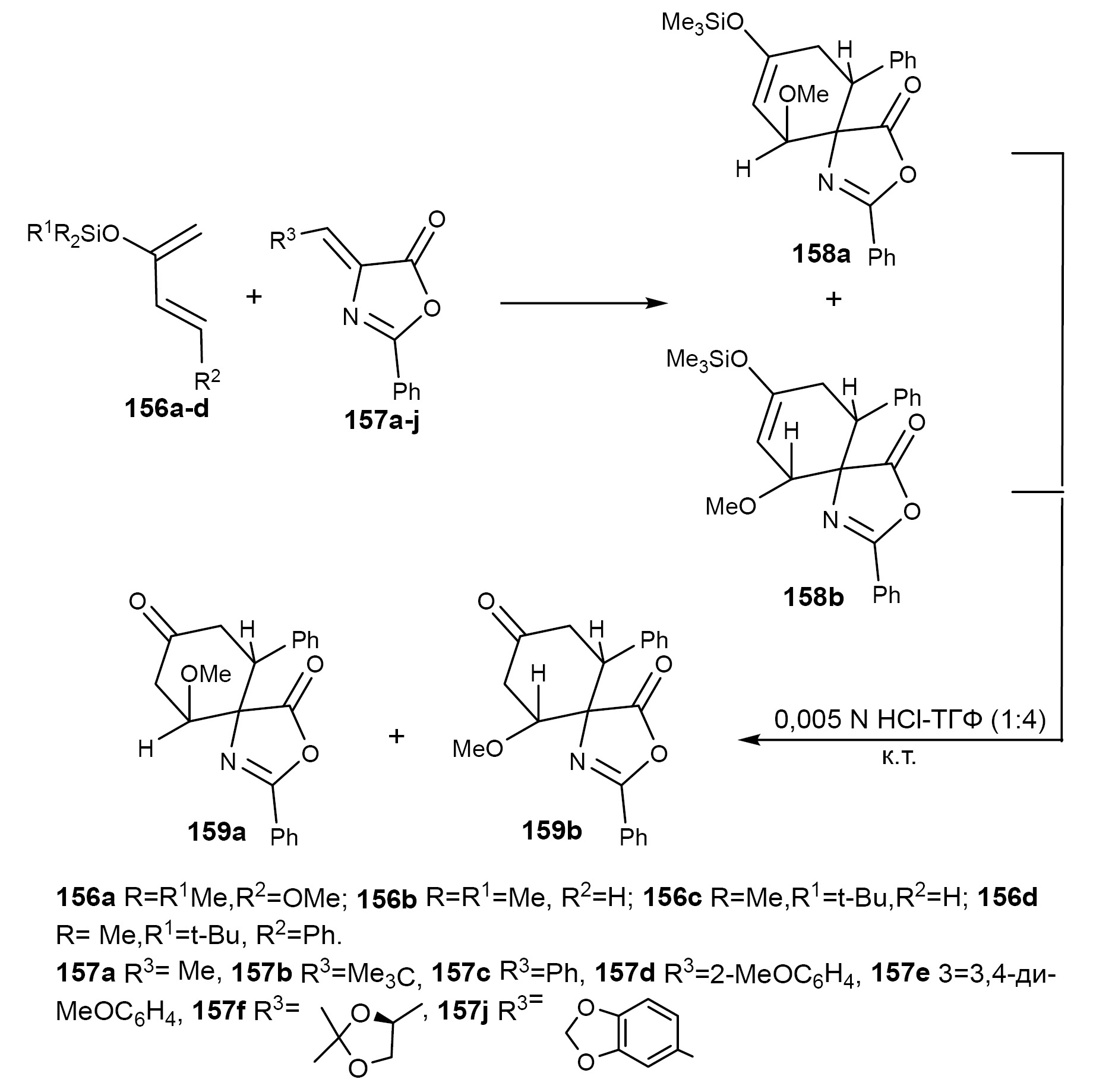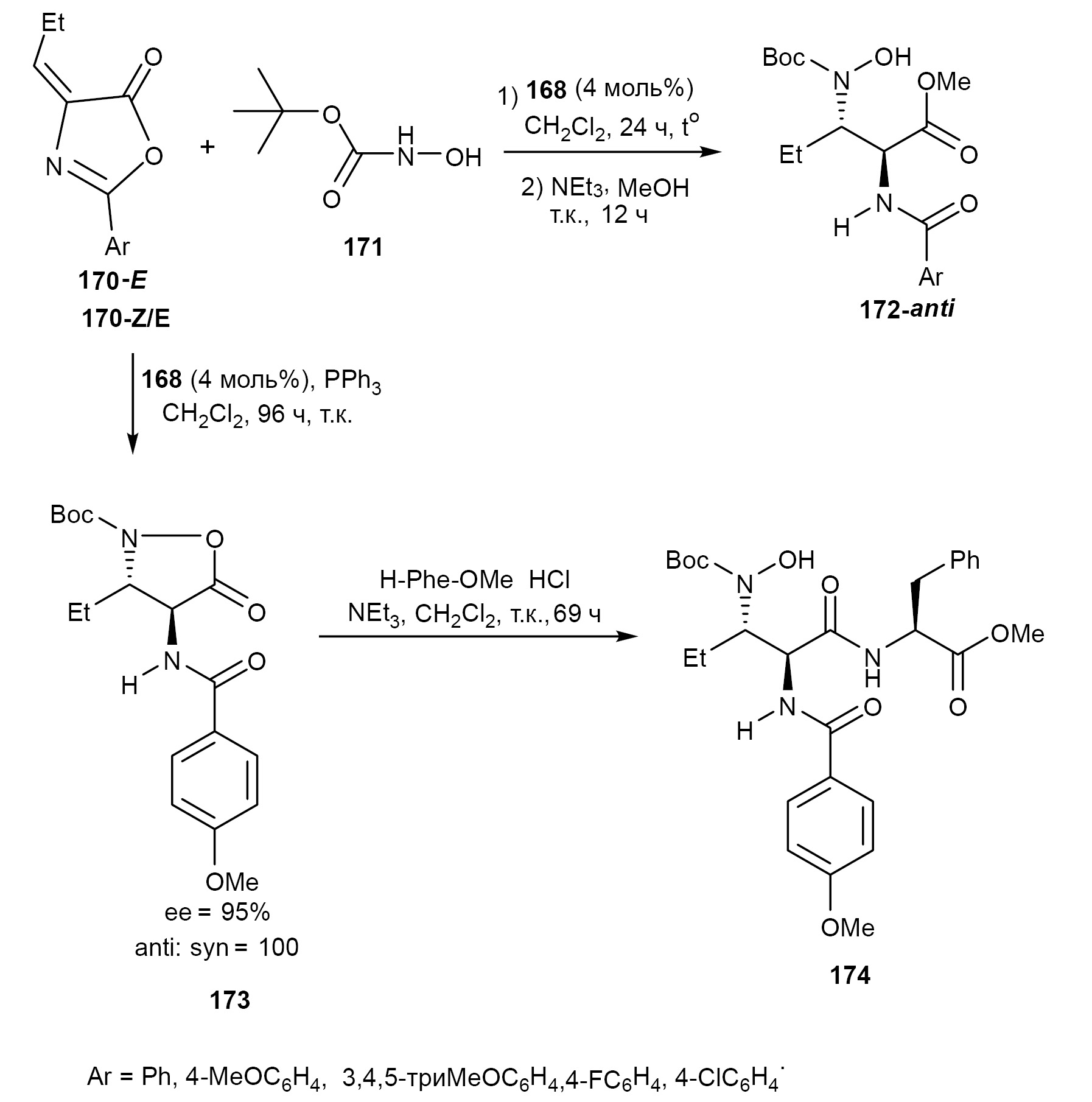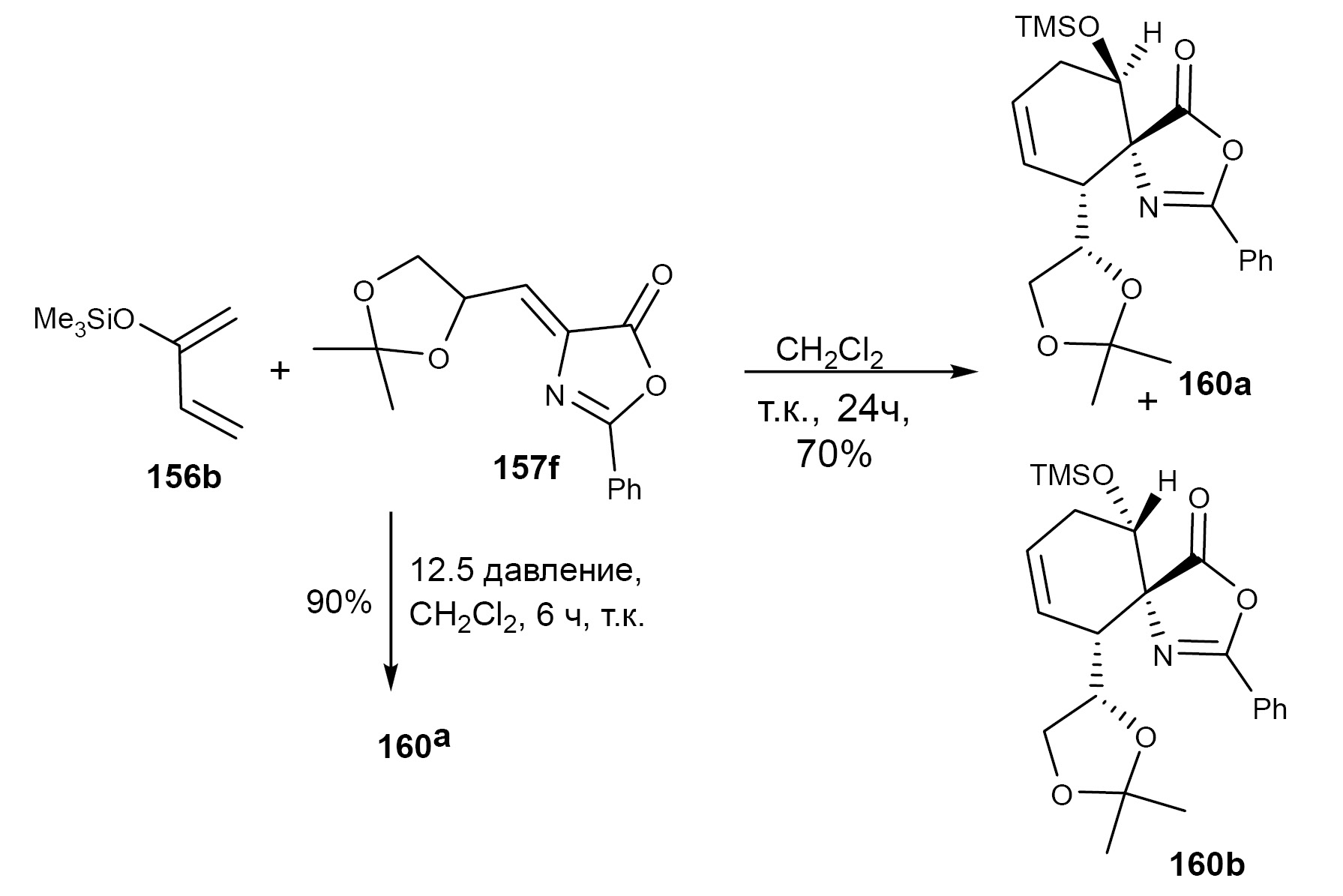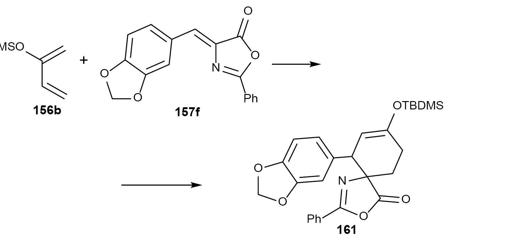 Отмечается [16] также, что замена индола 28 на метиловый эфир ((трет-бутилдиметилсилил)окси)-2-диазобут-3-еновой кислоты (31) не приводит к [3+2]-присоединению с оксазолоном 29.