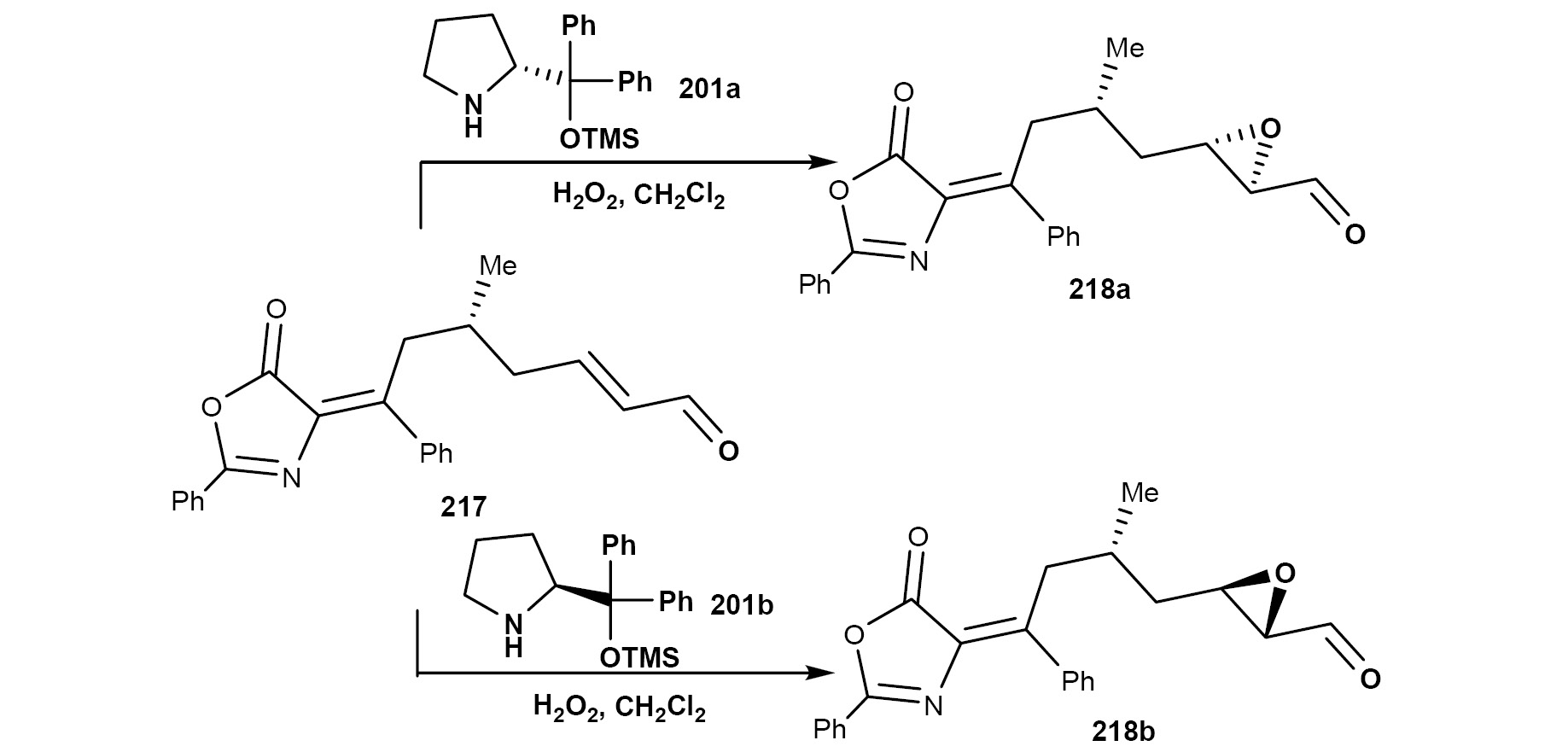 По данным [28], С-алкилирование 2-фенил-5-((триизопропилсилил)окси)оксазола (56: R = Me, R1 = i-Pr) с кротональдегидом (58) и хлорирующим агентом 59 в присутствии органокатализатора 60 протекает с высоким выходом (97%) и энантиоселективностью (˃99 ее) (схема 16).