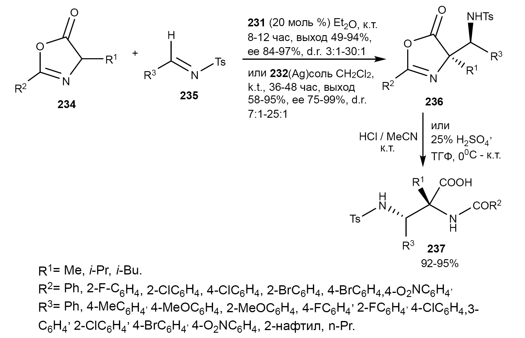 Эта мультикомпонентная реакция с хорошими выходами (51-78%) была осуществлена также однореакторным способом – взаимодействием оксазолона 5, альдегида 8 и амина 9 в присутствии ТМХС в дихлорметане (схема 2, путь В) [1–3]. Установлено, что заместители при оксазолоне 5 (R1 и R2) имеют существенное влияние на диастереоизомерную чистоту продукта [3–5].