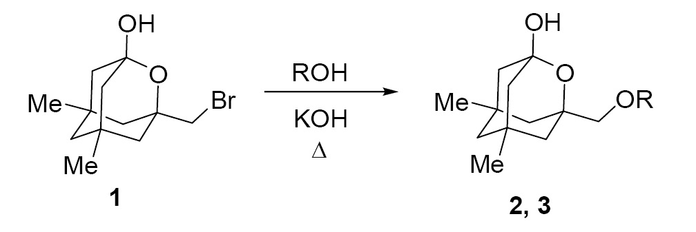 В качестве объекта исследования использовали 5,7-диметил-3-бромметил-2-оксаадамантан-1-ол (1), синтез которого описан ранее [50]. Реакции нуклеофильного замещения субстрата 1 проводили в присутствии основания. Синтез спирта 2 осуществляли в результате длительного кипячения в водном ТГФ в присутствии КОН. Продукт 2 выделили с выходом 86% после перекристаллизации из гексана. Аналогично был получен 5,7-диметил-3-бутоксиметил-2-оксаадамантанол-1 (3) с выходом 72% после очистки методом колоночной хроматографии (схема 1).