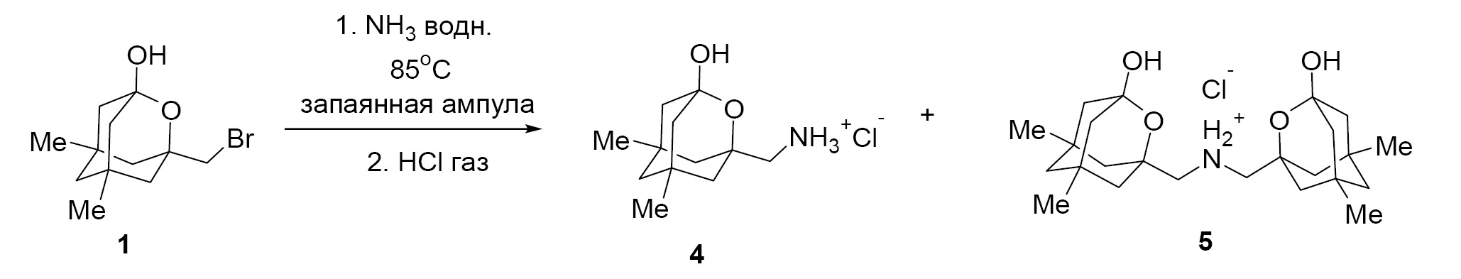 Гидрохлорид (5,7-диметил-3-гидрокси-2-оксаадамант-1-ил)метанамина (4) получали взаимодействием субстрата 1 с 25%-ным водным раствором аммиака в запаянной ампуле при температуре 85°С в течение 24 ч с последующим пропусканием тока сухого хлороводорода. В ходе реакции образуется продукт двойного алкилирования 5. Соединения 4 и 5 получены с выходами 41 и 17% соответственно (схема 2). В спектре ЯМР 1Н соединения 4 присутствует сигнал протонированной аминогруппы при 8.01 м.д. в виде синглета. В спектре ЯМР 13С четвертичный атом углерода, связанный с аминометильной группой, проявляется при 73.6 м.д. Метиленовый атом углерода, соединяющий каркас и аминогруппу, проявляется при 48.3 м.д. В спектре ЯМР продукта 5 сигнал протонированной аминогруппы проявляется при 8.22 м.д. в виде уширенного синглета.