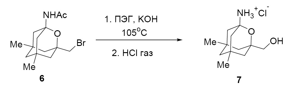 Из N-[3-(бромметил-5,7-диметил-2-оксаадамантил)ацетамида (6) [51] щелочным гидролизом в среде полиэтиленгликоля получили гидрохлорид 1-амино-3-гидроксиметил-5,7-диметил-2-оксаадамантана (7). Реакцию проводили при 105°С в течение 25 ч. Выход продукта 7 после перекристаллизации из смеси диоксан–толуол составил 32 % (схема 3). В спектре ЯМР 1Н сигнал протонированной аминогруппы проявляется в виде синглета при 8.87 м.д., сигнал протона ОН группы резонирует при 3.52 м.д. в виде синглета. В спектре ЯМР 13С сигнал четвертичного атома углерода, связанного с протонированной аминогруппой, проявляется при 83.2 м.д.