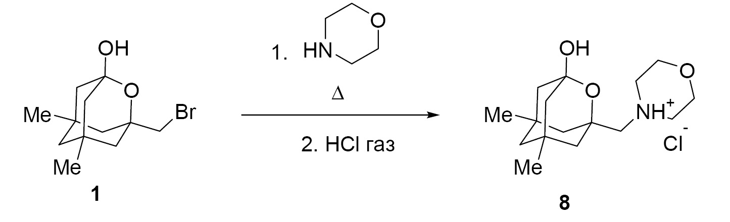 При взаимодействии исходного субстрата 1 с морфолином образуется 3-(4-морфолинил)метил-2-оксаадамантанол-1, который выделяли в виде гидрохлорида (8). Реакцию проводили при длительном кипячении (схема 4).