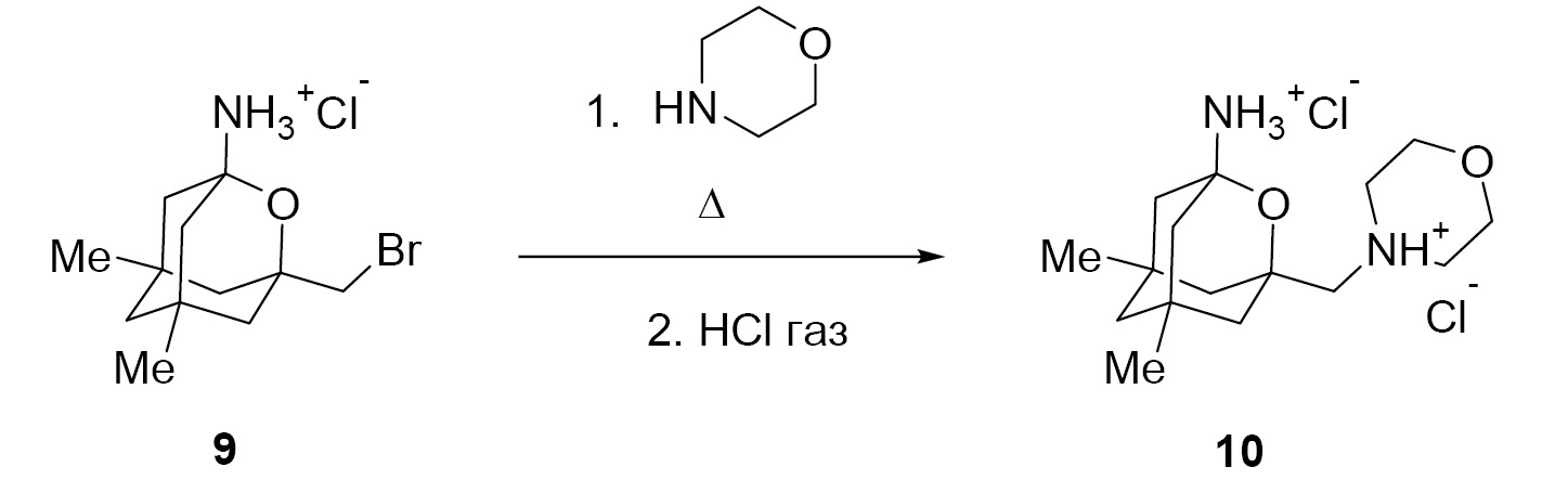 При кипячении соединения 9 [51] в морфолине образуется 5,7-диметил-3-(морфолинометил)-2-оксаадамантан-1-амин, который был выделен в виде дигидрохлорида 10 (схема 5).