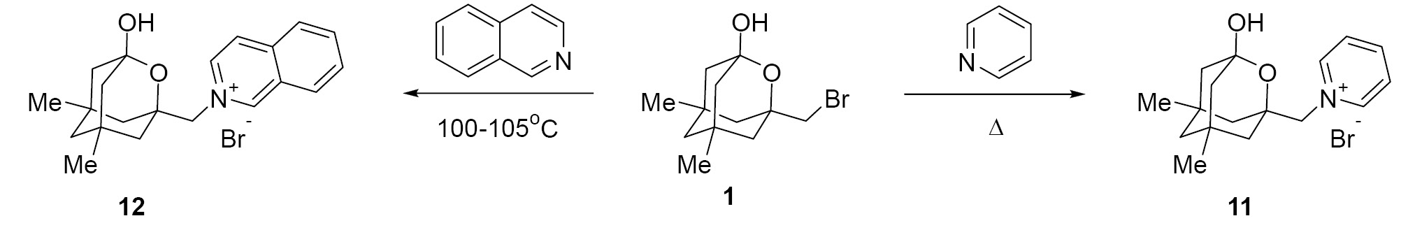 Бромид ((3-гидрокси-5,7-диметил-2-окса-1-адамантил)метил)-1-изохинолиния (11). Раствор 3 г (0.011 моль) соединения 1 в 7.2 мл (0.061 моль) изохинолина нагревали при 100–105 °С в течение 54 ч в атмосфере аргона. Затем реакционную смесь охлаждали до комнатной температуры, прибавляли диэтиловый эфир и перемешивали при комнатной температуре. Осадок отфильтровывали и промывали эфиром для удаления непрореагировавшего 5,7-диметил-3-бромметил-2-оксаадамантанола-1 (1). Выход 0.65 г (15%). Бежевые кристаллы, т.пл. 227–229 °С. ИК-спектр, ν, см-1: 3263, 3043, 3016, 2943, 2916, 2862, 2839. Спектр ЯМР 1H (CDCl3), δ, м.д.: 0.83 с (6Н, СН3), 0.97–1.00 м (2Н, CHAd), 1.12–1.34 м (6Н, CHAd), 1.59–1.62 м (2Н, CHAd), 5.14 c (2H, CH2), 7.86–7.90 м (1Н, СНAr), 8.06–8.12 м (2Н, СНAr), 8.38 д (1Н, J 6.8 Гц, СНAr), 8.79 д (1Н, J 8.0 Гц, СНAr), 9.05 д (1Н, J 6.8 Гц, СНAr), 10.78 с (1Н, СНAr). Спектр ЯМР 13C (CDCl3), δ, м.д.: 29.0 (СН3), 33.1 (Cчетв.), 41.9 (СН2), 47.0 (СН2), 48.1 (СН2), 67.6 (СН2), 75.8 (Cчетв.), 96.8 (Cчетв.), 125.7 (CH), 127.0 (CH), 127.5 (Cчетв.), 131.0 (CH), 131.8 (CH), 136.9 (CH), 137.1 (CH), 137.6 (Cчетв.), 151.1 (CH). Найдено, %: С 62.45; Н 6.40; N 3.55. С21Н26BrNО2. Вычислено, %: С 62.38; Н 6.48; N 3.46. Маточный раствор упаривали и выделяли 1 г соединения 1.