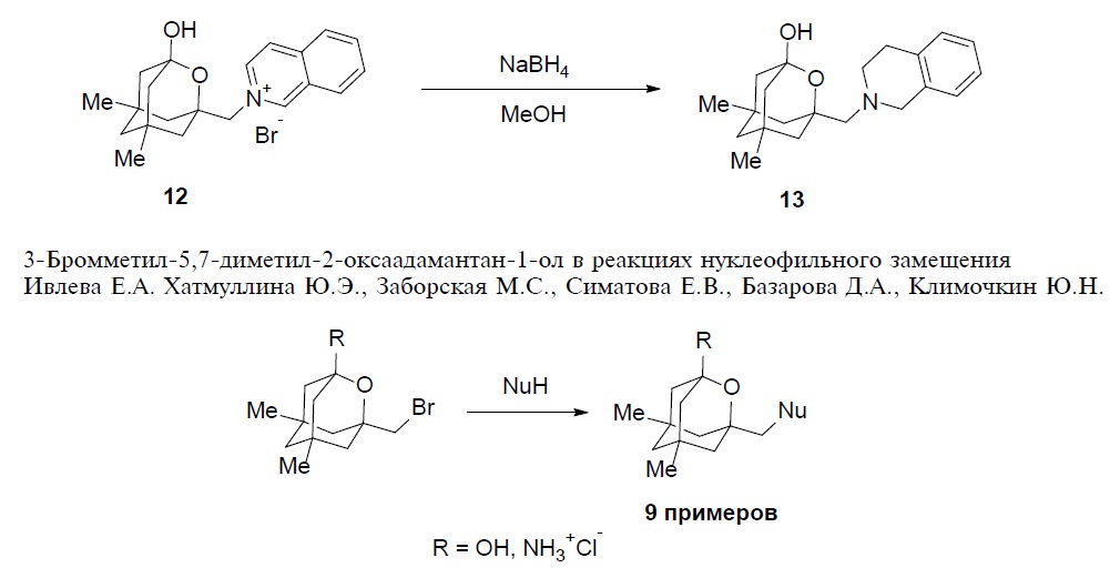 Бромид 2-(5,7-диметил-1-гидрокси-2-оксаадамантан-3-ил)метилизохинолиния (12) восстанавливали боргидридом натрия в метаноле при температуре 0°С (схема 7). В результате был получен соответствующий продукт 13 с выходом 49% в виде желтого масла. Структуру соединения 13 подтверждали методом ЯМР спектроскопии.
