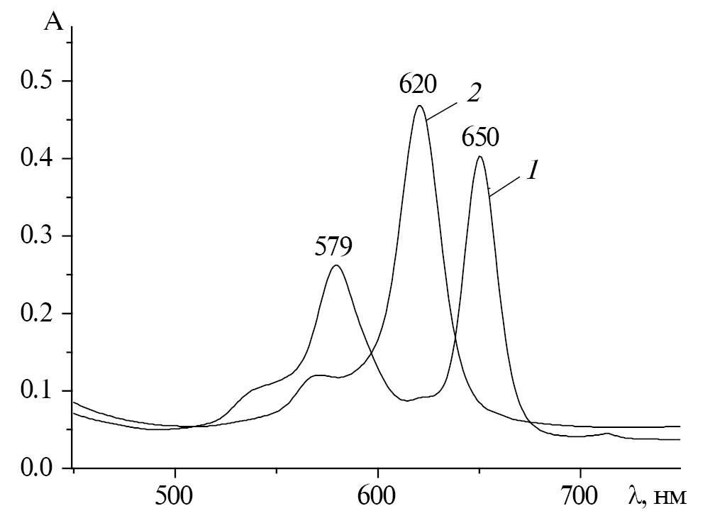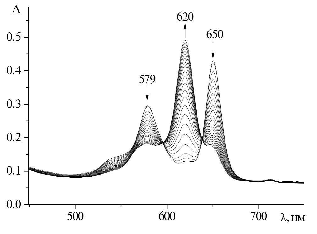 Предварительно установлено, что в среде инертного бензола электронный спектр поглощения (ЭСП) H2Pa(C6H3F2)8 имеет в видимой области 2 расщепленные Qх- и Qy- составляющие Q-полосы с λI = 650 и λII = 579 нм соответственно, что указывает на D2h-симметрию молекулы (рис. 1). В среде протоноакцепторного пиперидина (н-бутиламина) расщепление Q-полосы исчезает в результате повышения симметрии молекулы от D2h до D4h (рис. 1). Этот факт свидетельствует о том, что H2Pa(C6H3F2)8 проявляет свойства двухосновной NH-кислоты и образует с основаниями устойчивые во времени комплексы с переносом протонов. На это указывает характер ЭСП H2Pa(C6H3F2)8 в пиперидине (н-бутиламине), который не претерпевает изменений в течение ~57 ч при температуре 333 К (рис. 1).