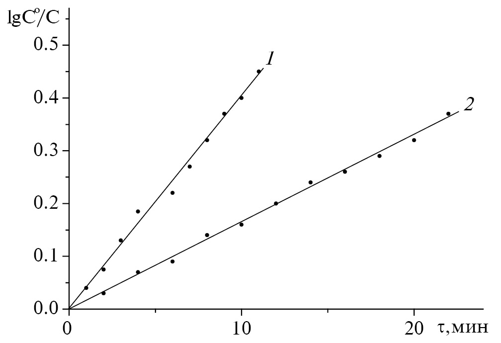 Рис. 4. Зависимость lgCo/C от времени реакции H2Pa(C6H3F2)8 с пиперидином (1), н-бутиламином (2) в бензоле при 343К и СоPip = СоBuNH2= 3.80 моль/л