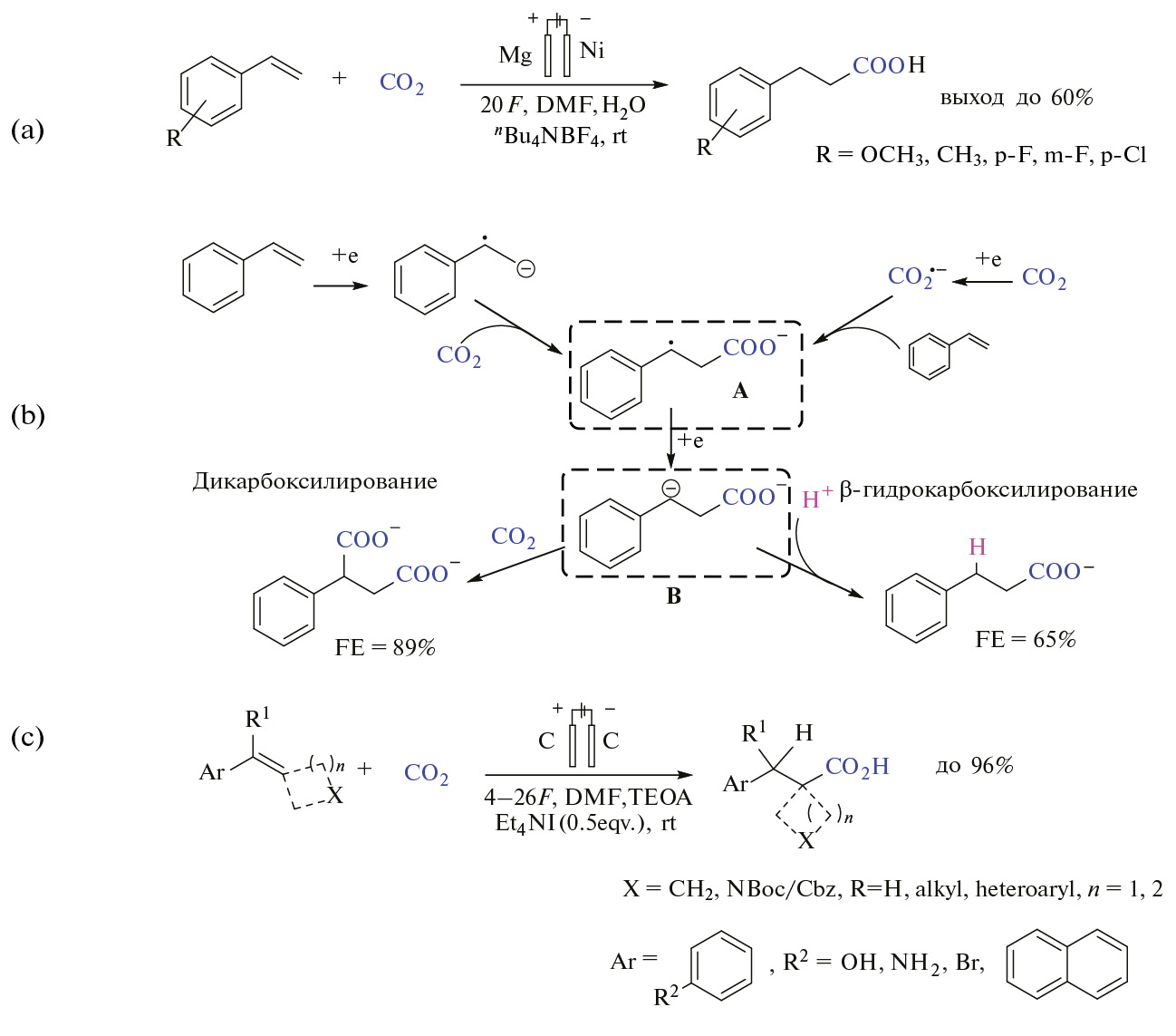В первых работах по электрокарбоксилированию с участием СО2 [34–36] использовали растворимые аноды из Mg, Al и бездиафрагменные электролизеры простой конструкции. Интересно, что многочисленные попытки отказаться от растворимых анодов в дальнейшем, хотя и успешные в ряде случаев, показали эффективность предложенных конструкционных решений для реакций различных ненасыщенных соединений. С участием алкенов в основном получали продукты дикарбоксилирования. Так, электрохимическое дикарбоксилирование фенилзамещенных алкенов в присутствии CO2 (атмосферное давление) с Pt-катодом и Mg-анодом в растворе ДМФА и Et4NClO4 дает при температуре 0–10°С соответствующие дикарбоновые кислоты с высоким выходом выделенного продукта до 91% (схема 1, а) [35]. Электрохимическое дикарбоксилирование стирола в присутствии CO2 (атм.) с Ti-катодом и Mg-стержневым анодом легко и эффективно протекает в растворе MeCN и Et4NBr с образованием 2-фенилянтарной кислоты с выходом до 86% (схема 1, b) [36].