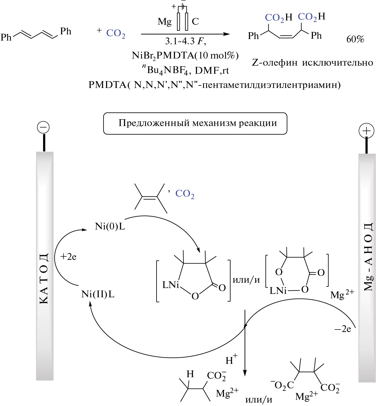 Каталитическая система Ni(II)/Ni(0) приводила к образованию исключительно дикарбоновой кислоты Z-олефина с хорошей селективностью. Общий механизм карбоксилирования был предложен для различных тестируемых алкенов. Предполагалось, что Ni(0) одновременно координируется с олефином и СО2 с образованием промежуточного оксаникелациклопентанона (схема 4). Кислота Льюиса, в данном случае анодно генерируемые ионы Mg2+, способствуют раскрытию этого металлацикла, элиминированию продукта и регенерации Ni(II) [40]. Терминальную двойную связь не удалось вовлечь в реакции функционализации ни с одной протестированной каталитической системой [40]. В случае арилалкенов или активированных олефинов предполагается введение второй молекулы CO2 в металлацикл, который после гидролиза приводит к 1,2-дикарбоновым кислотам.