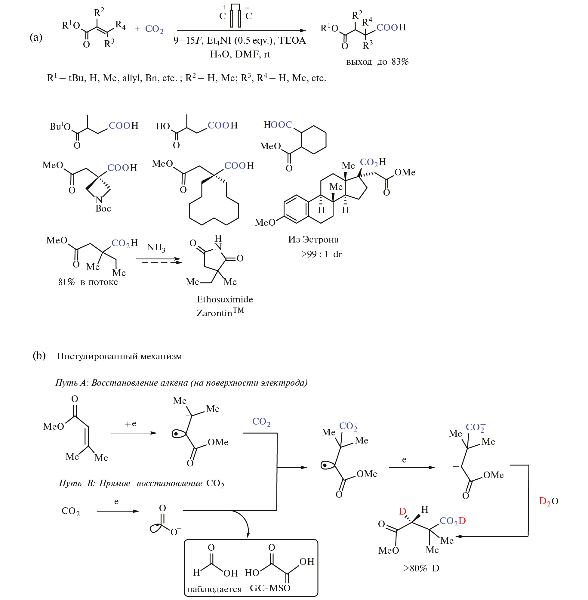 Высокоселективное электрокарбоксилирование α,β-ненасыщенных эфиров [43] позволяет напрямую синтезировать карбоновые кислоты из α,β-ненасыщенных эфиров, не содержащих ароматические заместители, и CO2 с хорошими выходами (схема 7, a). Методом ГХ–МС обнаружено образование щавелевой кислоты (продукта радикальной димеризации CO2) и предложен механизм реакции (схема 7, b). Близость потенциалов восстановления акрилатов и СО2 предполагает их конкурентное восстановление на электроде. Процесс был преобразован в проточный достаточно просто, что позволило реализовать граммовый синтез предшественника противоэпилептического средства этосуксимида (схема 7, а). Реакция также применима к функционализации природных соединений, например, производного эстрона.