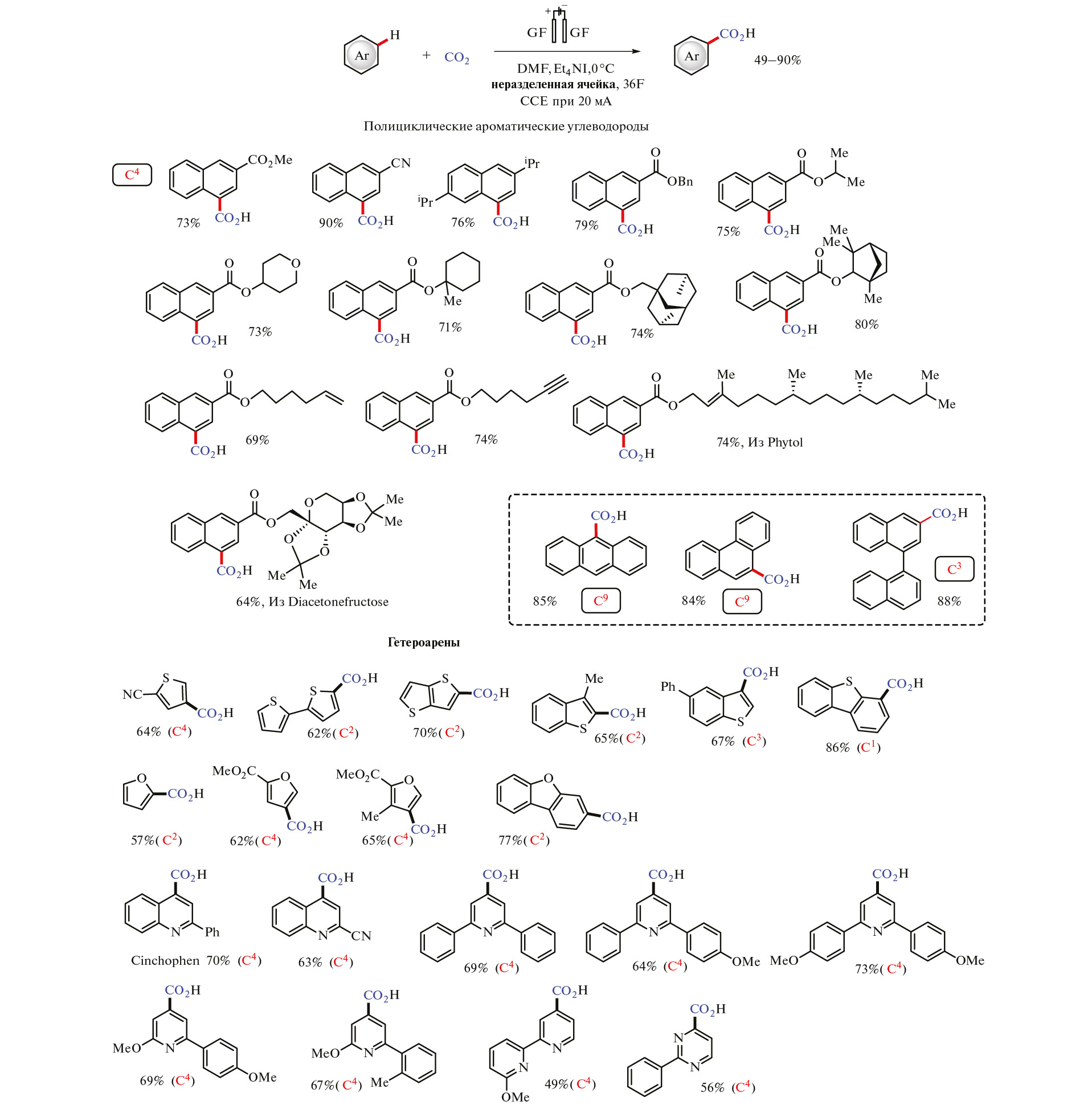 В качестве электродов использовали доступный и дешевый графитовый фетр, Et4NI в качестве электролита в неразделенной ячейке (то есть без разделения анодного и катодного пространств, без диафрагмы), синтез проводили в гальваностатическом режиме. В данных условиях реакция происходит в положении с более высокой плотностью электронов в кольце, как правило это C4, что было рассчитано с использованием теории функционала плотности (DFT) и в принципе совпадает с расчетами и данными литературы [52]. Ценные арилкарбоновые кислоты были получены из коммерчески доступных исходных материалов, причем методика масштабируется. Исследования механизма реакции показали, что поскольку потенциалы восстановления аренов сильно зависят от их природы и функциональных заместителей, реакция может инициироваться как восстановлением ароматической молекулы, так и в некоторых случаях (для трудно восстанавливающихся субстратов) восстановлением СО2 [53]. Возможный механизм предполагает ключевую роль анодно-генерируемого иода, аналогично описанному в литературе [52]. Метод продемонстрировал высокие хемо- и региоселективности и применим к сложным аренам, включая электронодефицитные нафталины, простые фенильные производные, пиридины и замещенные хинолины.