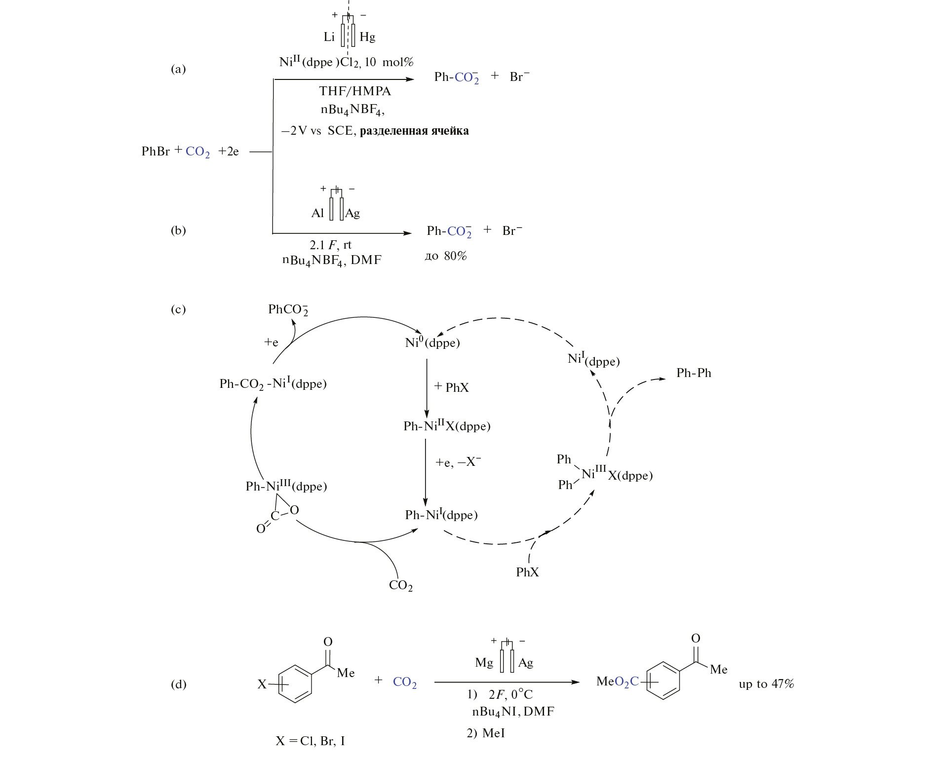 Использовали ячейку с разделением анодного и катодного пространства, ртутный катод и анод из литиевой проволоки, довольно экзотичные с современной точки зрения. Детальные кинетические вольтамперометрические исследования показали, что механизм никель-катализируемого электрокарбоксилирования включает цепную реакцию с участием интермедиатов Ni(0), Ni(I), Ni(II) и Ni(III), очень напоминающую по механизму установленное ранее катализируемое никелем сочетание бромбензола с CO2 (схема 22, с) [56]. Однако одной из ключевых стадий является взаимодействие сигма-никельорганического комплекса Ph—Ni(I)(dppe) с CO2.Окислительное присоединение дает Ph—Ni(III)(CO2)(dppe) интермедиат, который затем элиминирует PhCO2— . Тот факт, что присоединение CO2 к Ph—Ni(I)(dppe) происходит в 100–200 раз быстрее, чем PhBr к этому же интермедиату, объясняет, почему бифенильная цепь полностью распадается, когда диоксид углерода присутствует даже в стехиометрических количествах в реакционной среде. Ключевой скорость-определяющей стадией является стадия внедрения–перегруппировки Ph–Ni(III)(CO2) в PhNi(I)–OC(O)(dppe) интермедиат, который затем элиминирует PhCO2— (схема 22, с).